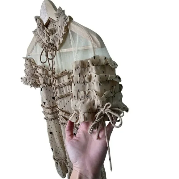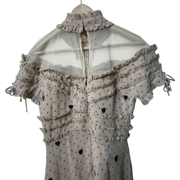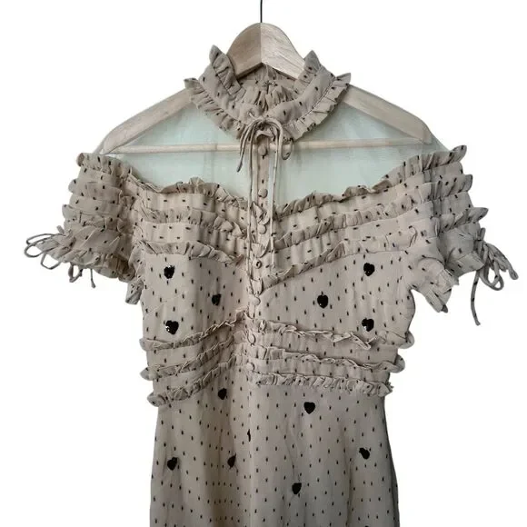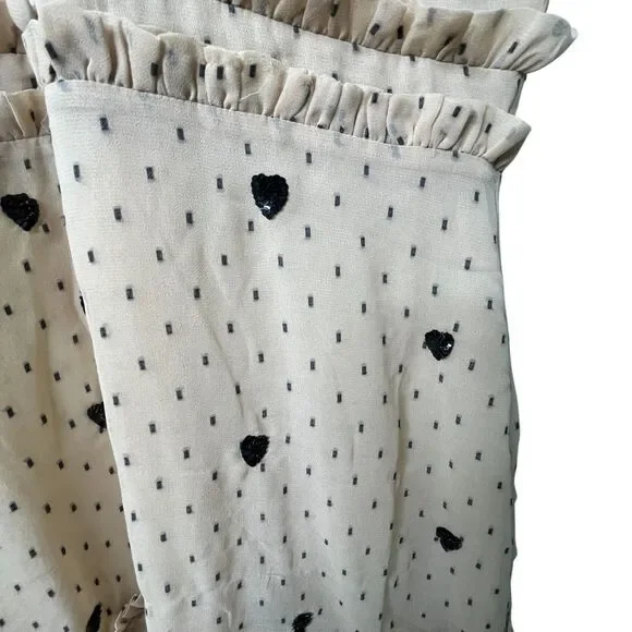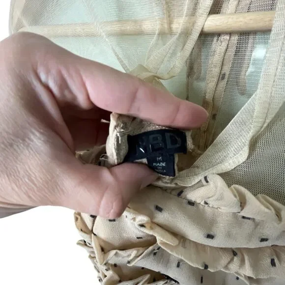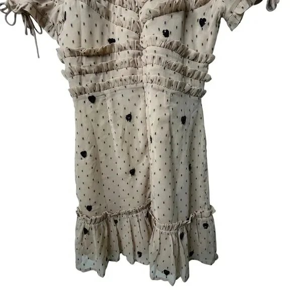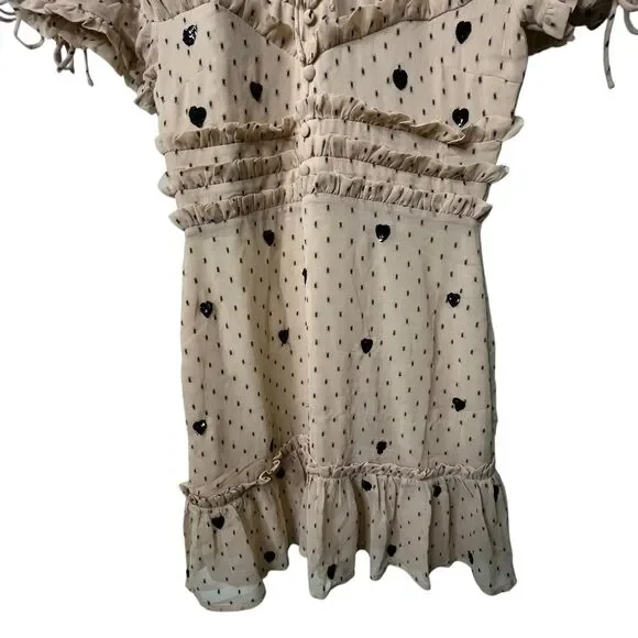 NBD Cherry Pie Mini Dress Sz M Nude Black Polka Dot Sequin Heart Ruffle RevolveExcellent pre-owned condition with no flaws. Measurements can be found in the photos!NBD Cherry Pie Mini Dress, Nude with Black Sequin Hearts and Black Polka Dots, Fully lined. Mock Neckline. Hidden back zipper closure. Ruffle detail. Short Sleeve with Drawstring Tie Ruffle Detail Professional Seller, Fast Shipping, Offers welcome, Bundle and Save! TAGS: NBD, Mini Dresses, Valentine's Day, NBD Cocktail dresses, revolve cocktail dresses, revolve summer dress, NBD x REVOLVE, Summer, Spring, Anniversary, Party, Evening dress, feminine, classic, classy