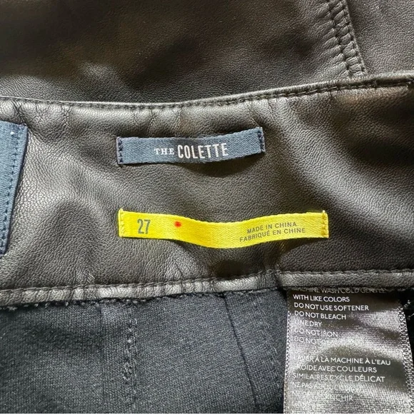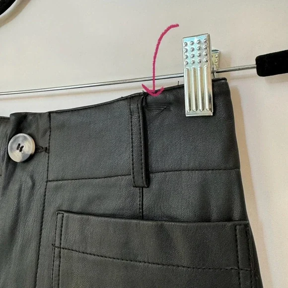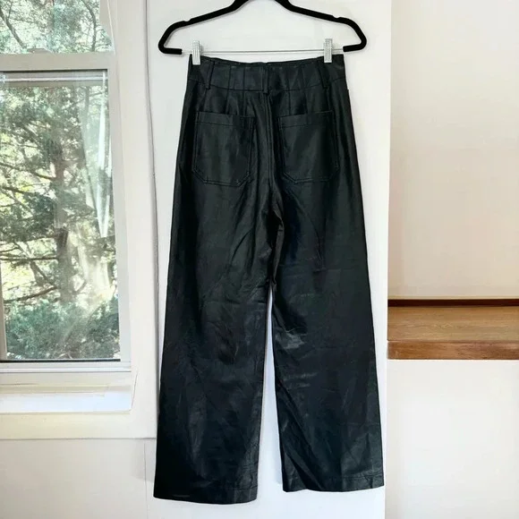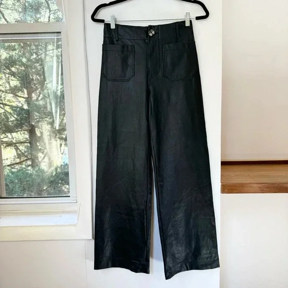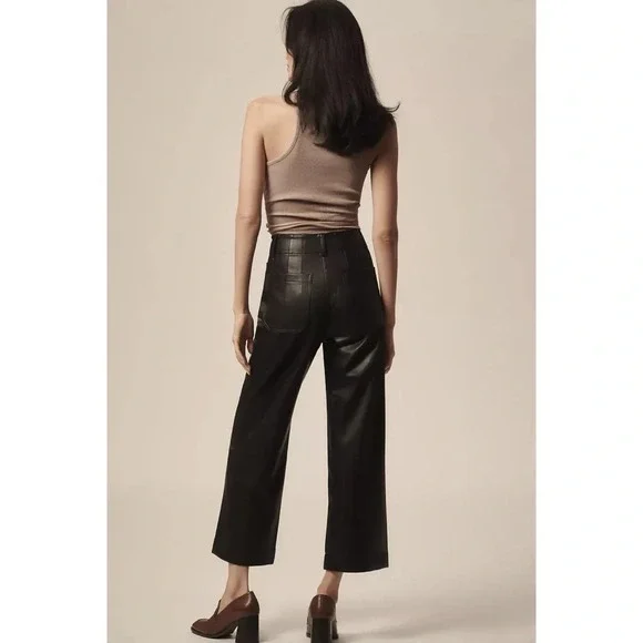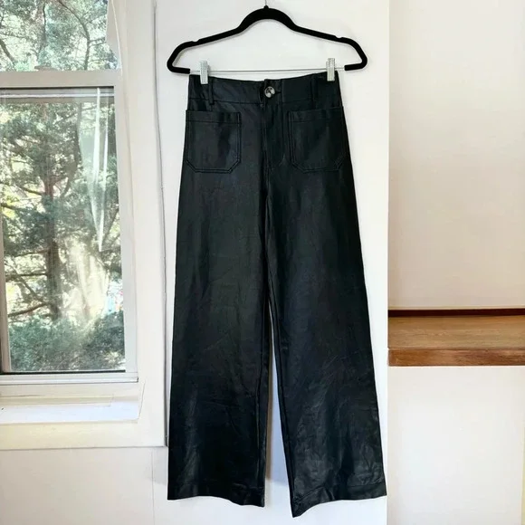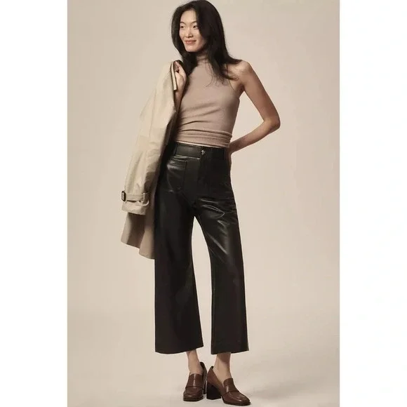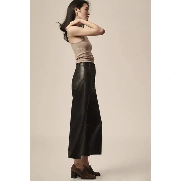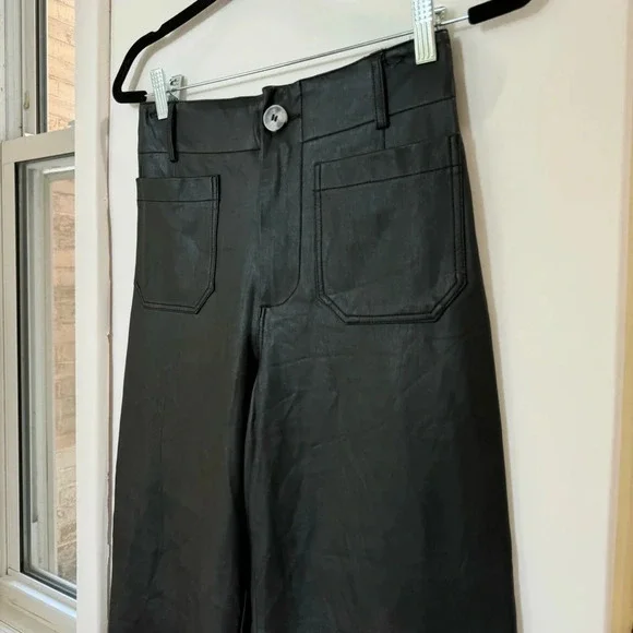 New Anthropologie The Colette Cropped Wide Leg Pants Maeve Faux Leather Blacknew without tags****note - there are marks from being on hanger on both sides near top seam, see pics with arrowsize 27official color: blackfaux leather blackmsrp: $148waist: 13.5 inhips: 16.5 in rise: 12 ininseam: 26 n95% viscose, 5% elastanemachine washStyle No. 4123583310007Give a nod to mod with the Colette. Cropped with flare, our rave-reviewed silhouette charms with a form-fitting high rise and a breezy wide leg.Front patch pocketsBack patch pocketsZip frontcollette, pant, pants, faux leather, winter, color, summer, spring, fall, maeve, flowy, trousers, high rise, high waisted, casual, everyday, colete, comfortable, lightweight, weekend, travel, beach, palazzo, vacation, trouser, wanderer, wide leg, flare, straight leg, crop, cropped,