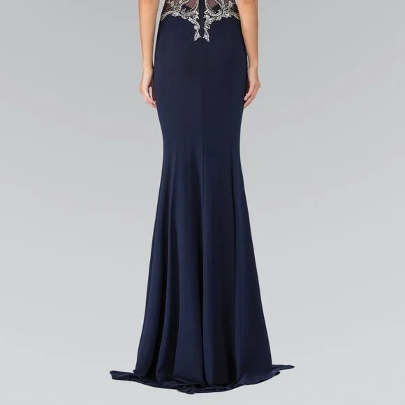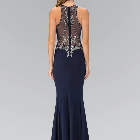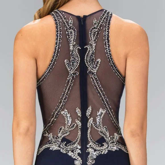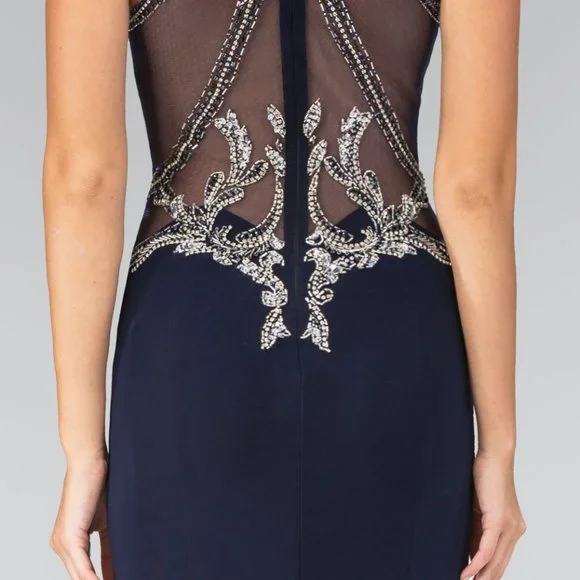 Long Formal Evening Dresses with high neckline, sleeveless dress, sheer back with zippered closure, sheath shapeMaterial: 100% PolyesterSheer Back Long DressHigh Neckline Long Sheath SilhouetteStyle: High Neckline, Sheath Silhouette, Long, Sheer BackOccasion: Formal, Evening, Cocktail, Guest of Wedding, Bridal, Bridesmaid, Banquet, Prom, Ball, Graduation, Special Occasion.Garment Care: Dry Clean Suggested