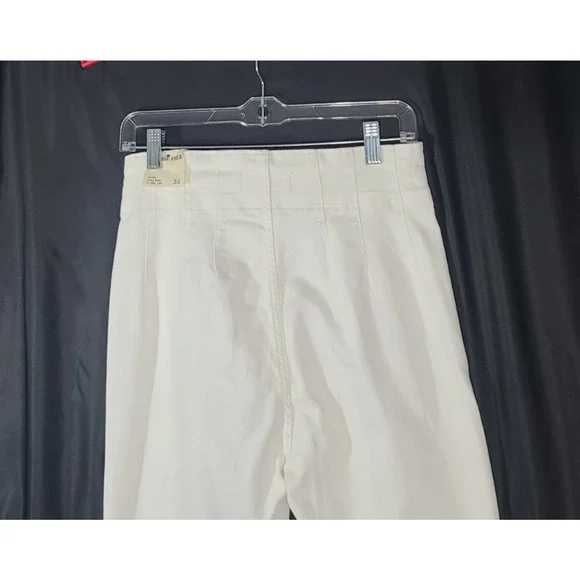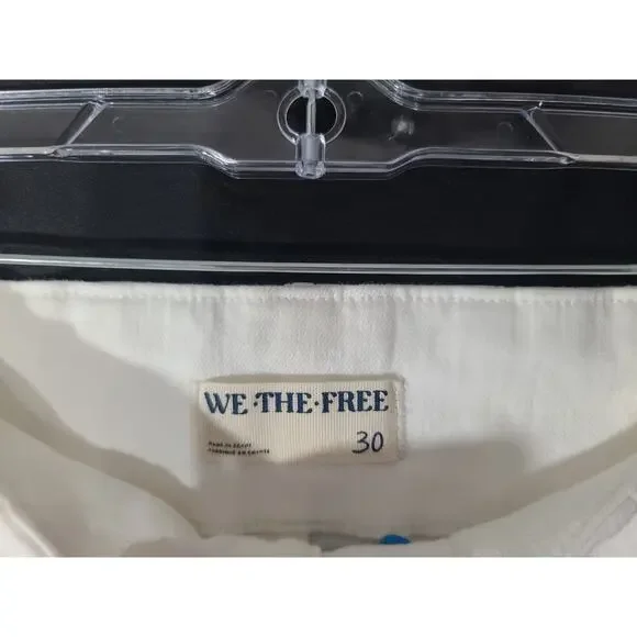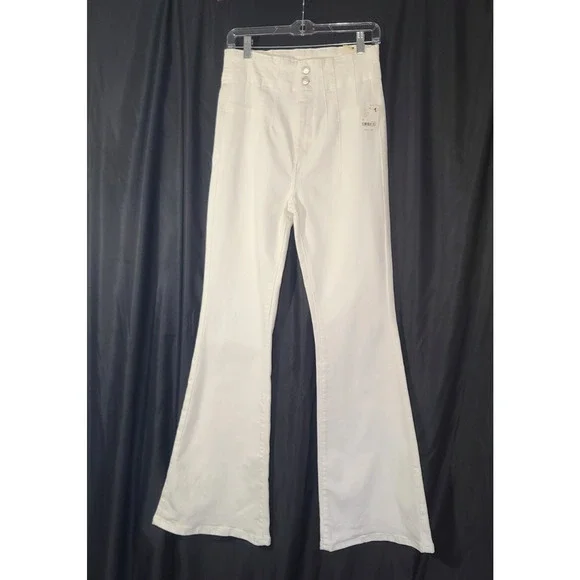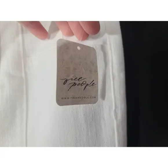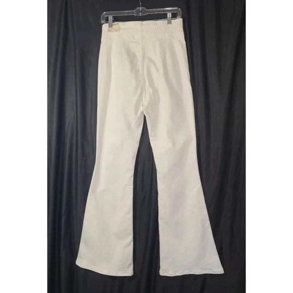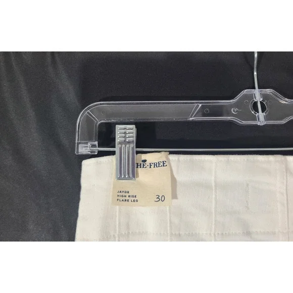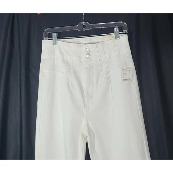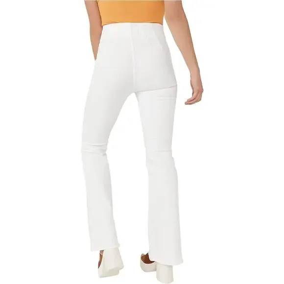 These We the Free Free People Pure White Jayde High Rise Flare Leg 30 jeans are brand new with tags, featuring a solid white color and a high-rise fit. Made from a comfortable blend of polyester and cotton, they have a light fabric wash and are machine washable for easy care. The flared leg style and regular fit make them a versatile option for any season, while the zip and button closure adds a stylish touch with the brand's logo accents. Perfect for a casual yet chic look, these jeans are a stylish addition to any woman's wardrobe.New with tag91% cotton, 7% polyester, 2% elastanewaist- 30hip- 36rise- 13inseam- 32