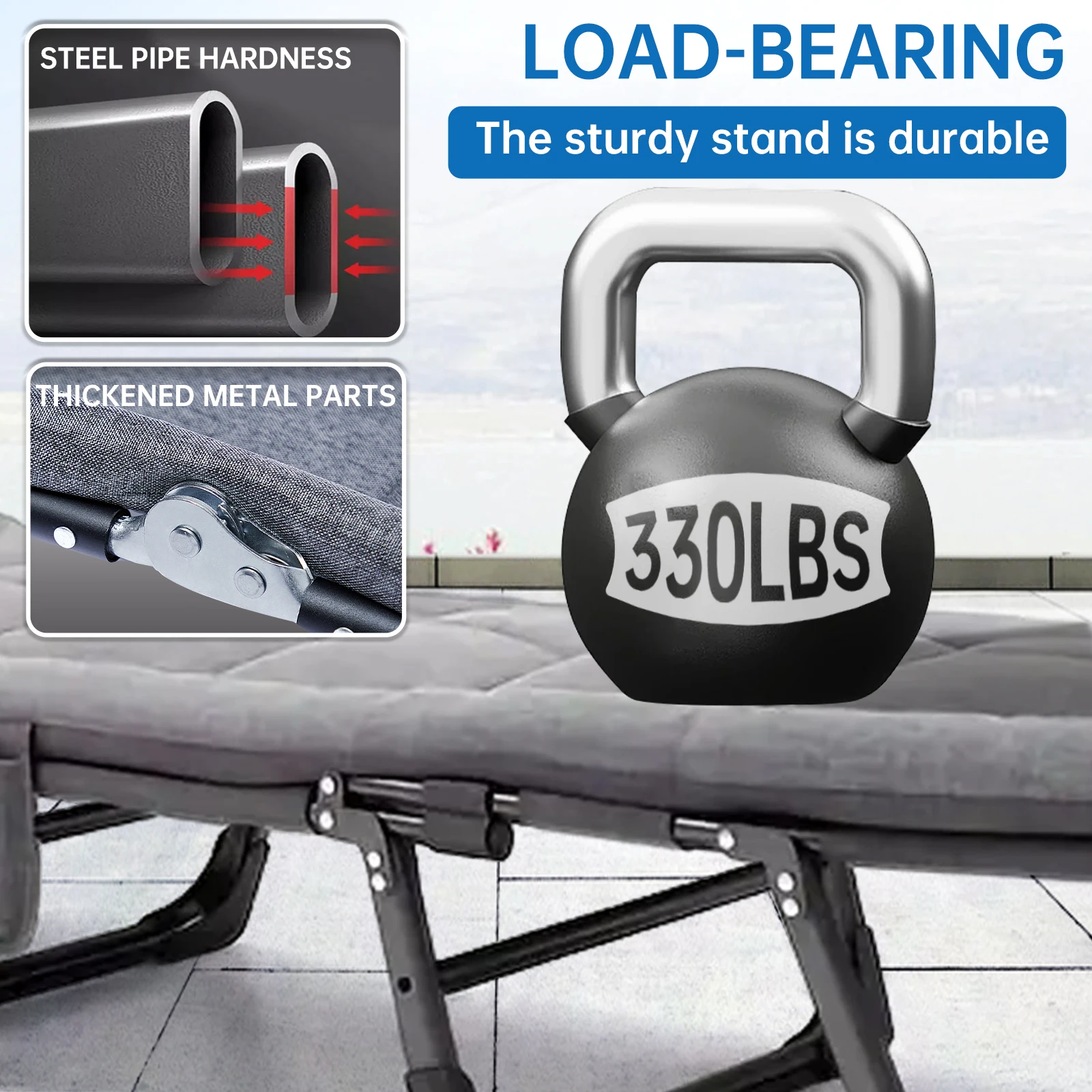 [Sturdy and Compact] - Camping Cots frame steel tube adopts full plane articulation design, the whole bed frame structure is especially solid, the waist position increases the elastic Oxford weave to support the lumbar vertebrae, each foot with a non-slip pad, strong support, anti-slip and stable. (Maximum load-bearing capacity up to 550 lbs.)