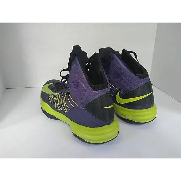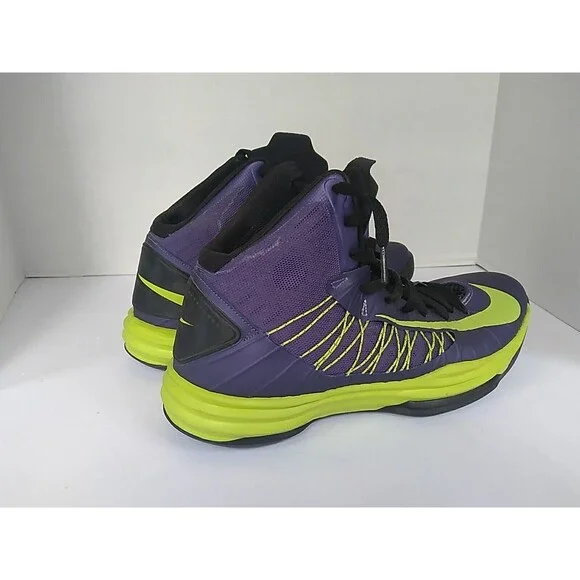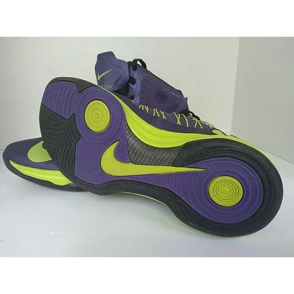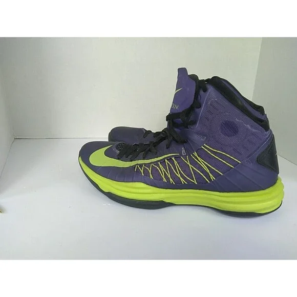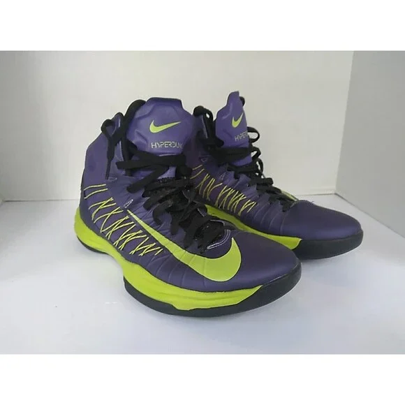 Command attention on and off the court with these Nike Hyperdunk basketball shoes. A vibrant fusion of purple and green creates a striking visual impact, while the high-top design offers enhanced ankle support for confident movements. The iconic Nike swoosh in a bold green adds a touch of athletic flair, complementing the shoe's overall dynamic aesthetic. These sneakers are perfect for dominating the game, hitting the gym, or making a statement with your street style.Keywords: Nike Hyperdunk, basketball shoes, high top sneakers, purple basketball shoes, green basketball shoes, athletic shoes, performance sneakers, men's basketball shoes, Nike sneakers, Hyperdunk shoes, court shoes, training shoes
