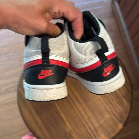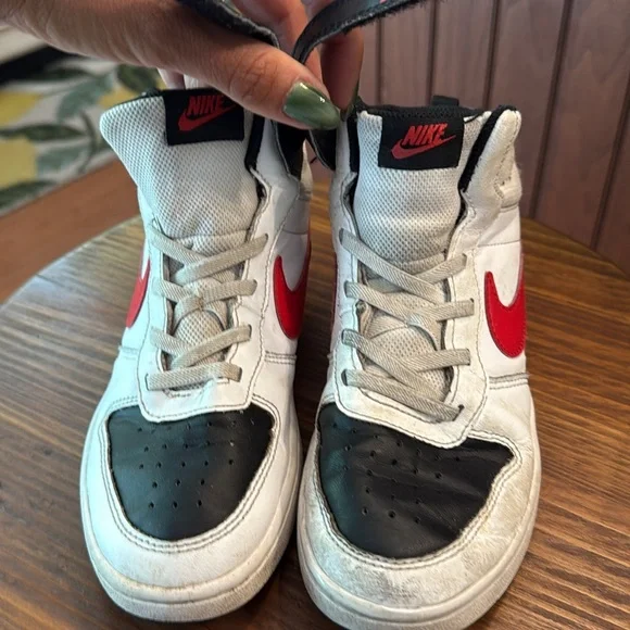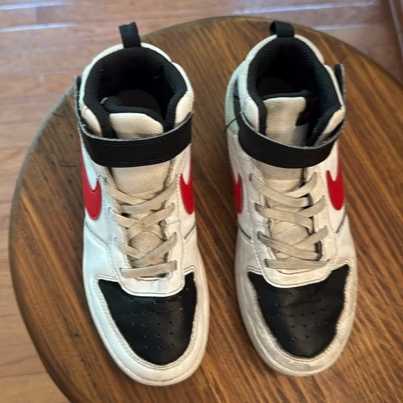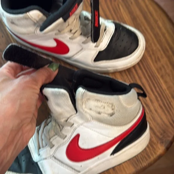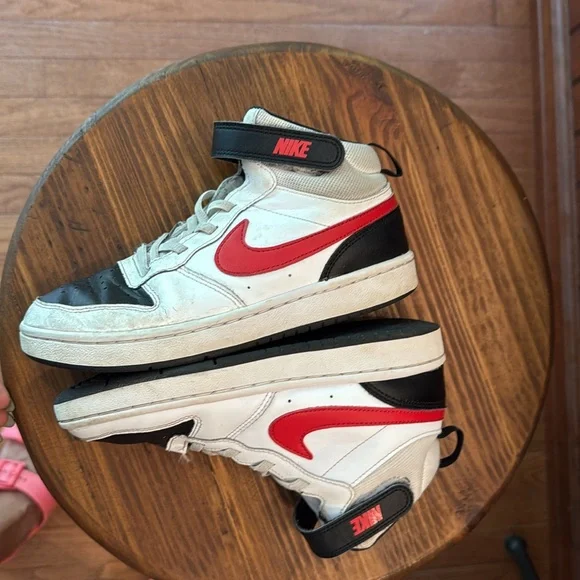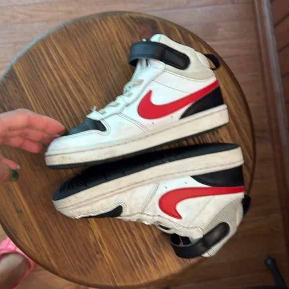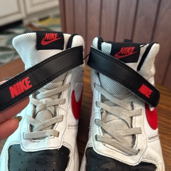 These Nike high-top sneakers showcase a striking red and black colorway, embodying a classic basketball shoe design. With a bold red swoosh and black accents, they offer a timeless look perfect for both casual wear and athletic activities. Great used condition. Insoles clean, soles like new. Uppers very good. Some scuffs as pictured. Straps very tight seal with velcro. great deal!!