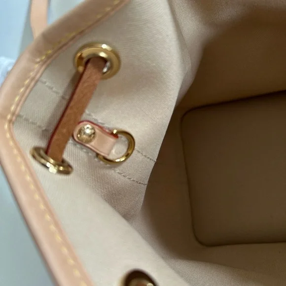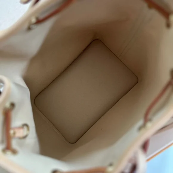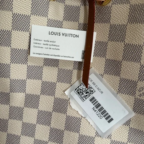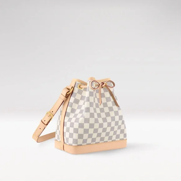 The Noé BB bucket bag harks back to a design from 1932. A Champagne producer asked Gaston-Louis Vuitton to develop a sturdy, stylish bag in which he could transport five bottles of bubbly. This charming version in body-friendly Damier Azur canvas retains key features of the original – the iconic shape and drawstring closure – but is made for modern life. The leather strap adjusts for comfortable shoulder or cross-body wear.•Damier Azur coated canvas•Natural cowhide-leather trim•Textile lining•Gold-color hardware•Drawstring closure•D-ring•4 protective metal bottom studs•Strap:Removable, adjustable•Strap drop:19.7 inches•Strap drop max:21.7 inches8.7 x 9.4 x 5.9 inches(Length x Height x Width)