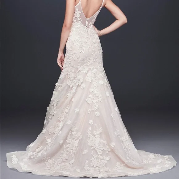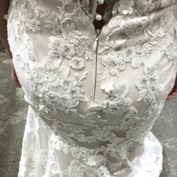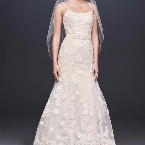 Oleg Cassini trumpet style wedding gown with floral appliqués and beaded straps. Belt not included. Dress has layers of ivory, silver shimmery tulle, blush lining. This dress was purchased as a sample so there are some flaws which include small hole in lace below zipper in back and missing buttons. These are easy fixes if you are handy. I had a couple of options, so This dress was not used after purchasing besides try ons. It’s a beautiful dress and a great deal! Size 4