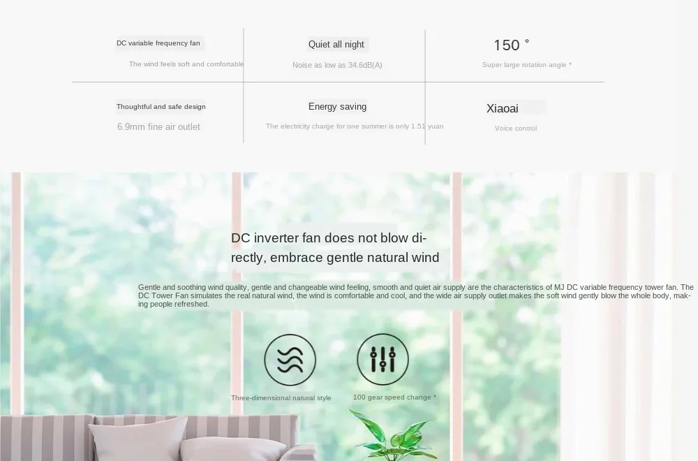 Gentle and soothing wind quaity, gentie and changeable wind feeling, smooth and quiet air supply are the characteristics of MJ DC variable frequency tower fan. The DC Tower Fan simulates the real natural wind, the wind is comfortable and cool, and the wide air supply outiet makes the soft wind gently blow the whole body, making people refreshed