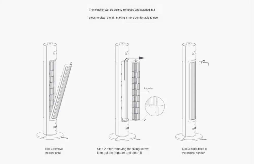 The impeller can be quickly removed and washed in 3 steps to clean the air, making it more comfortable to use