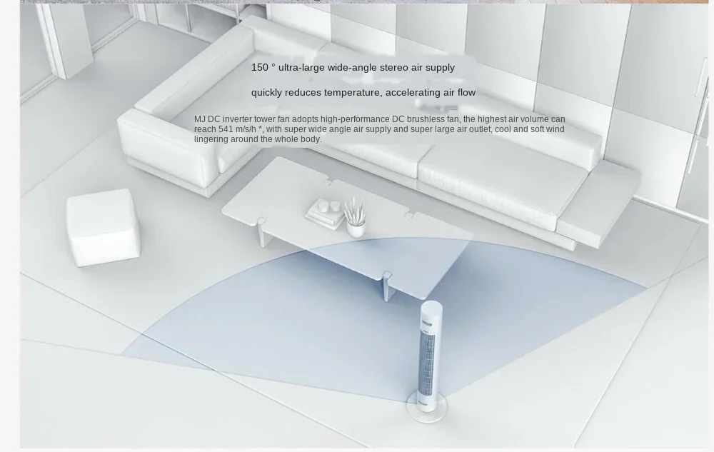 MJ DC inverter tower fan adopts high-performance DC brushless fan, the highest air volume can reach 541 m/s/h, with super wide angle air supply and super large air outlet, cool and soft wind lingering around the whole body.