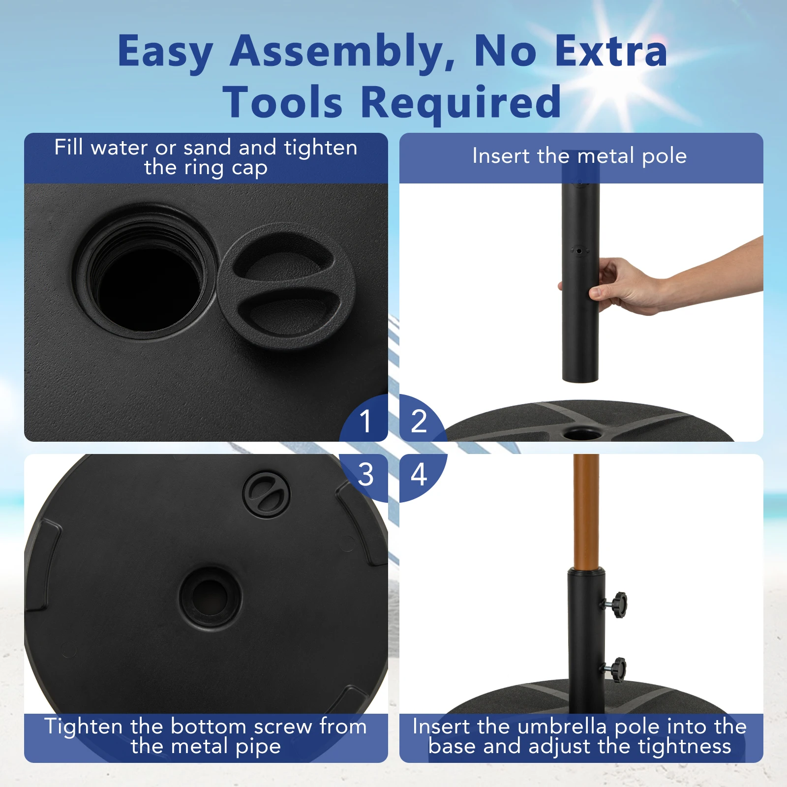 A secure solution to stabilize your round umbrella base. To keep your umbrella stable, the heavy-duty umbrella base can be filled with either 57 lbs of water, 66 lbs of sand, or 88 lbs of wet sand, making it suitable for 6-10 ft patio umbrellas. Furthermore, the patio umbrella base is equipped with 3 adapters, making it compatible with patio umbrellas featuring pole diameters of 1.89"/1.5"/1.42". Additionally, there are 2 turning knobs to ensure a secure fit of the umbrella pole. Constructed from high quality HDPE material, the umbrella stand offers exceptional durability. Also, the fillable base is designed for swift and effortless installation.