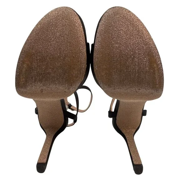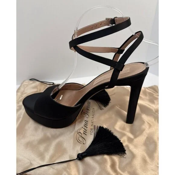 This collab between Pnina Tornai and Naturalizer is a signature women's forever elegant silhouettes heels. Perfect to elevate your bridal shower, wedding day, or special event. Sleek women's dress shoes with slender ankle straps.Embellished adjustable buckle closure with heart charmSatin upper with open toe.Non-slip glitter outsole with engraved quote. 0.75-inch platform3.75-inch heel. A captivating collection of wedding and occasion footwear for brides, bridal parties, mothers of the couple and guests. Forever elegant silhouettes with all day wearability, available in an inclusive range of sizes and widths. MPN: I6299F1Size: 9MUSColor: black satinAge Group: adultGender: femaleEU 40 UK 6.5UPC-A 017118091394, EAN-13 0017118091394Features:• Ai Platform Size: Womens 9Condition: Pre-Owned GoodNoteable wear on the bottom.Areas on sole where glitter is worn off. Original box and 2 dust bags included.Buckles & gem are present with no missing gems.The footbed has 2 dark spots on left foot.Minimal signs of wear on footbed.