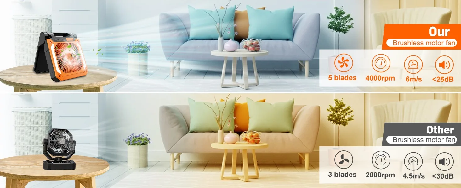 2.【10000mAh Capacity Battery & Power Bank】With a 10000mAh rechargeable battery, this portable fan provides 5-12 hours of cooling relief without needing an electrical outlet. Meanwhile, our battery powered table fan has a USB-A port that can be used as an emergency power bank for your phone as a camping gear.