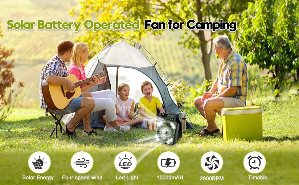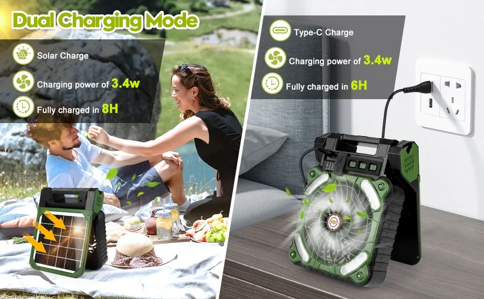 1.【Solar Charger & USB Battery Operated】Charge from the sunlight as fast as possible. Only 8 hours is taken to become fully charged via a high efficiency solar panel. Great design for outdoor travel, camping trip, power outage, hurricane ect. Additionally, 10000mAh camping fan allows you to charged by 5V2A usb outlet.