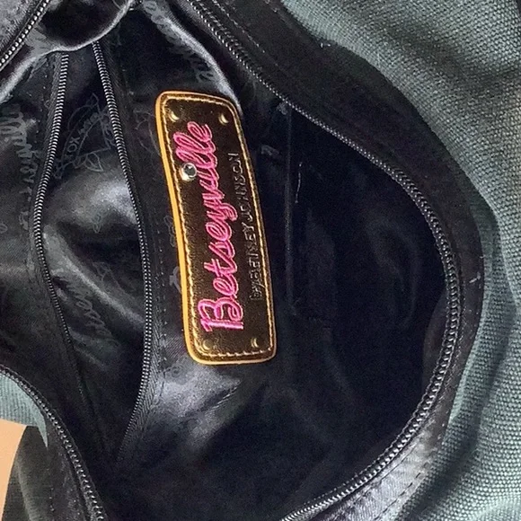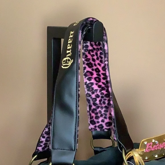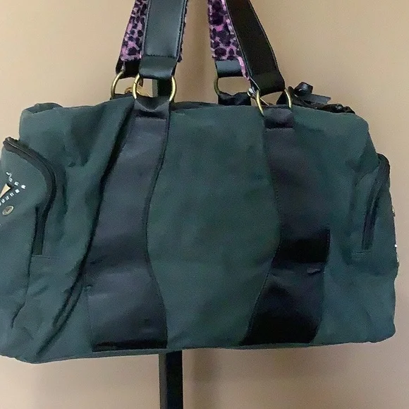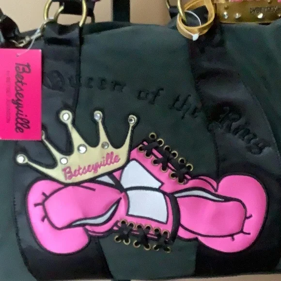 Rare NWT Betsey’s Knockout black weekender with awesome theme and hot pink accents. Base is 17” long and 10” high. 7” wide side zippered lightening bolt pockets and zippered opening. 13” zippered opening with black Betseyville satiny lining with one zippered pocket and one open. Fuzzy pink leopard print lined vinyl straps with a 10” hang. Boxing glove key fob.