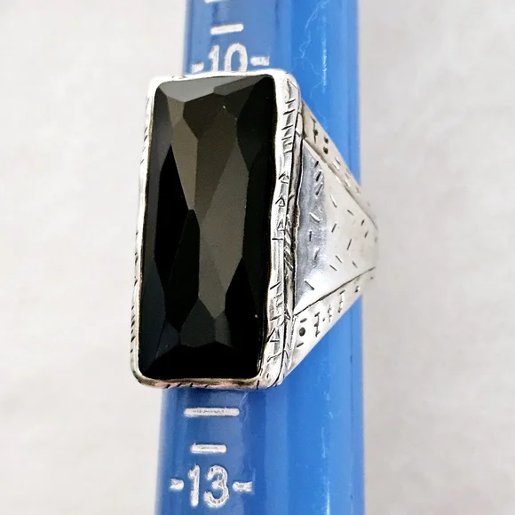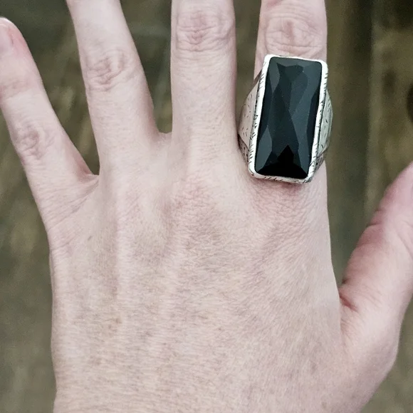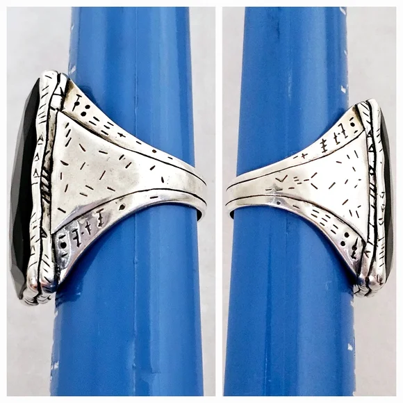"A formal flair for any affair!" ... Stand out in this stylish bold statement ring; VERY HTF size...this style is highly sought after.🖤Matches Black Tie bracelet,which I have listed for sale separately.🖤- 925 sterling silver tapered band; slightly hammered and oxidized; beautiful, intricate etched design- a stunning and very large rectangle faceted onyx stone- size is approx 11.25 (see pics)Excellent condition...Onyx stone is pristine! Ships in Silpada gift box.Please look at all non-stock photos as they are part of description. This is the item you will receive. I do my best to describe everything and give a lot of detailed photos for you, but please ask all questions *before* purchasing.⚡️Fast Shipping⚡️⭐️ 5-Star Trusted Seller ⭐️❤️ 100+ Love Notes/Reviews ❤️📷 Items photographed at shipment. Clean, N/S home. Actual color may vary.