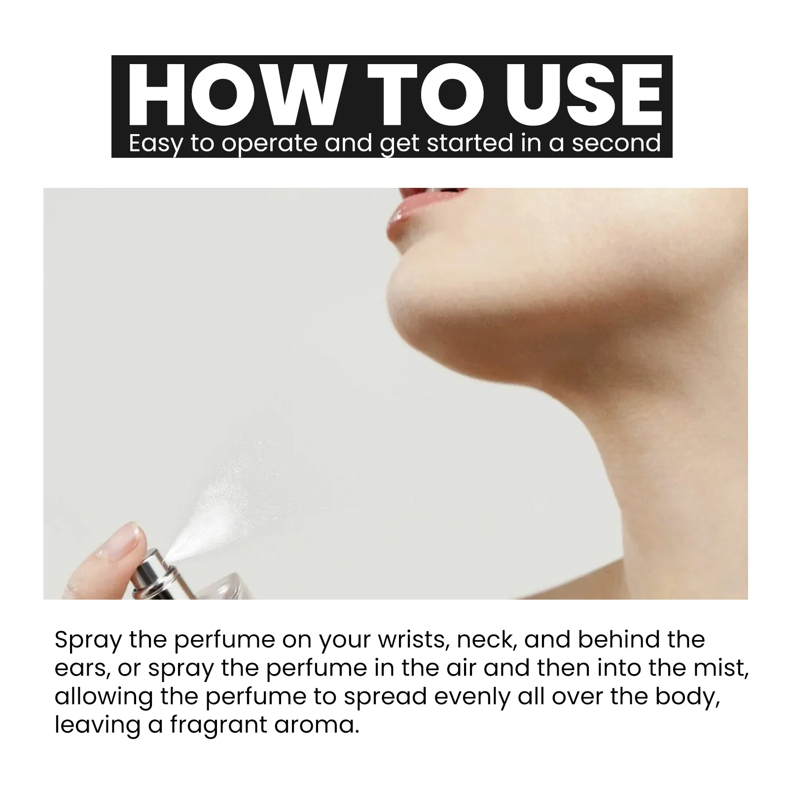 Open the bottle cap and spray the perfume on your hair, wrists, neck, behind the ears and other parts, and the fragrance will spread instantly.