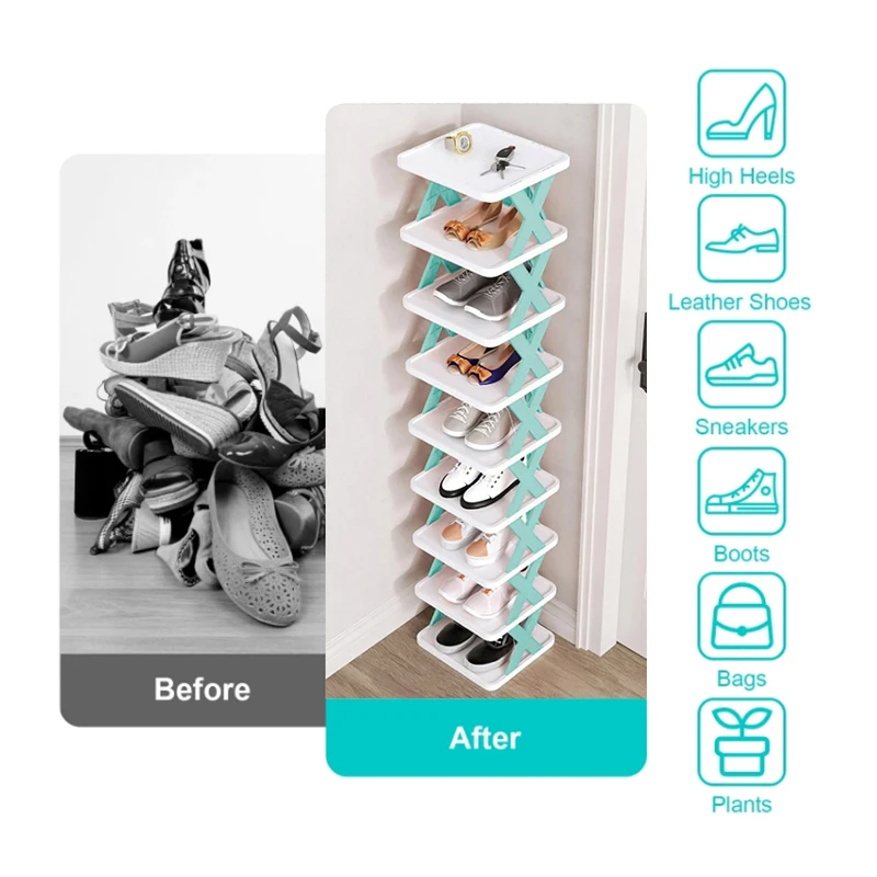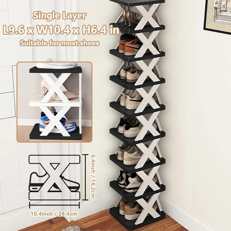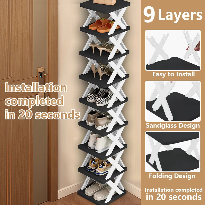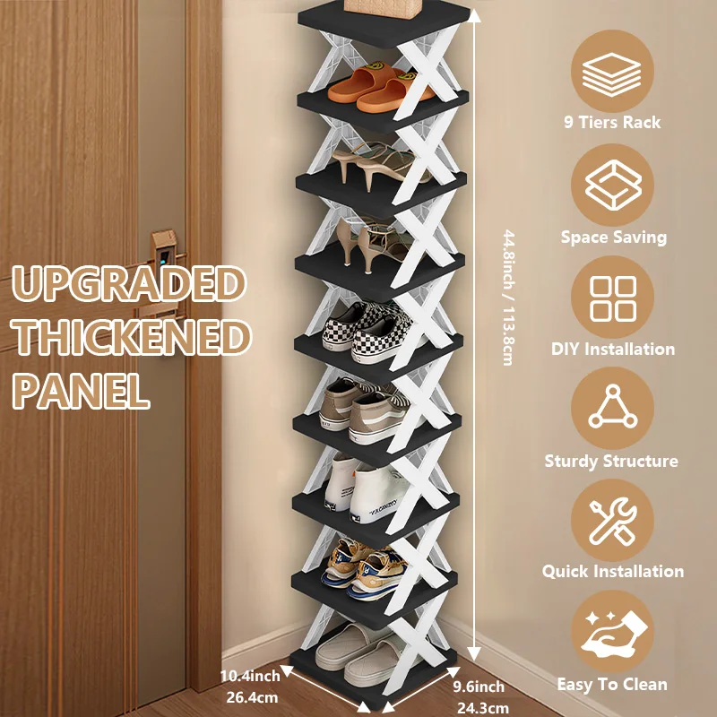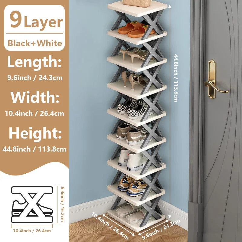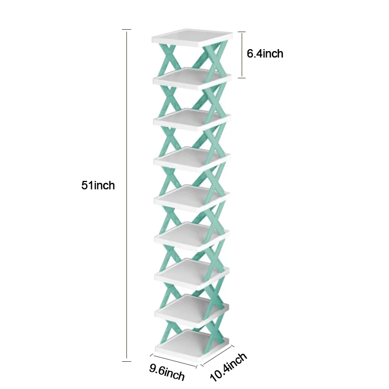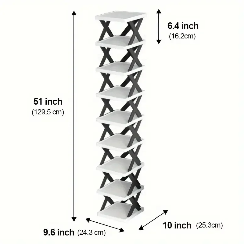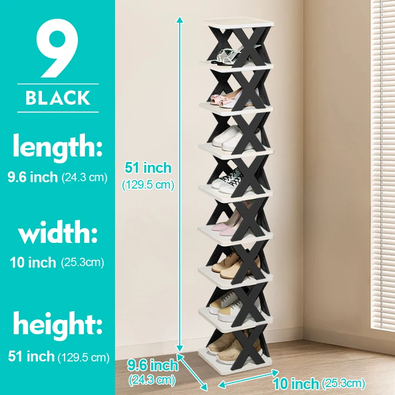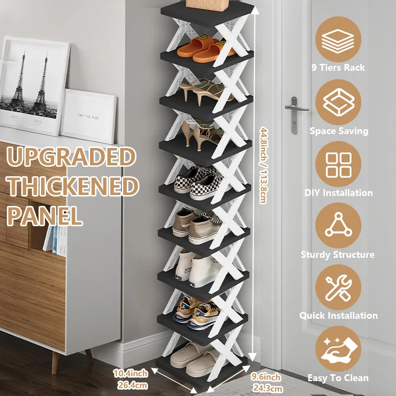 t Description: 9-Tier Shoe Rack Narrow Entryway Storage Organizer Plastic Detachable Shoe Shelf Space-Saving Closet Living Room Dorm Storage