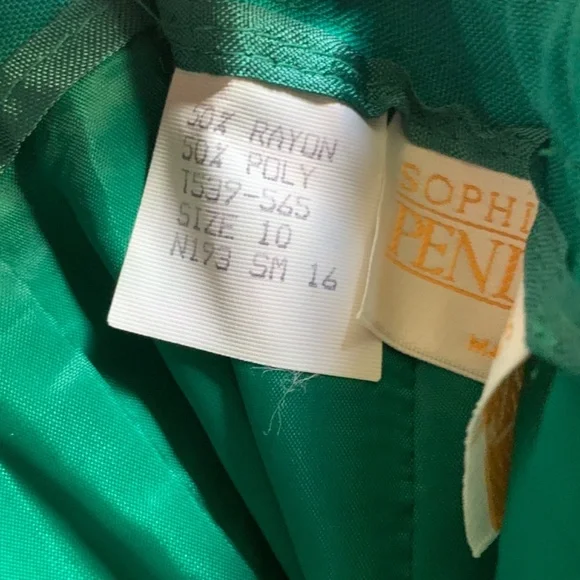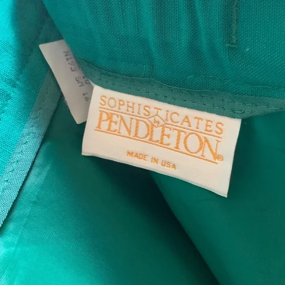 Sophisticates by Pendleton Skirt Suit SZ 10 Green Lined Knee Length Short SleeveDescriptionThis suit is in remarkable pre-owned condition. It has no rips, tears, stains or odors and will ship from a smoke free home.* Sophisticates by Pendleton Suit (2 Piece)* Size 10* Skirt & Jacket* 50% Rayon / 50% Polyester* Machine Wash* SkirtBack Zip / ButtonBack Slit* Top / JacketSix Buttons / Two Functional / Four Faux / 1 InteriorV-NeckNotched CollarMeasurements in Inches (laying flat)TOP18Chest28Length12SleevesSkirt30Waist (has elastic)40Hips26LengthPlease make your purchase(s) with confidence knowing that I will:* answer any questions quickly.* package your item(s) carefully, and ship promptly.* respond to issues in a timely and positive manner!Thanks for looking, and have a blessed day!Kat
