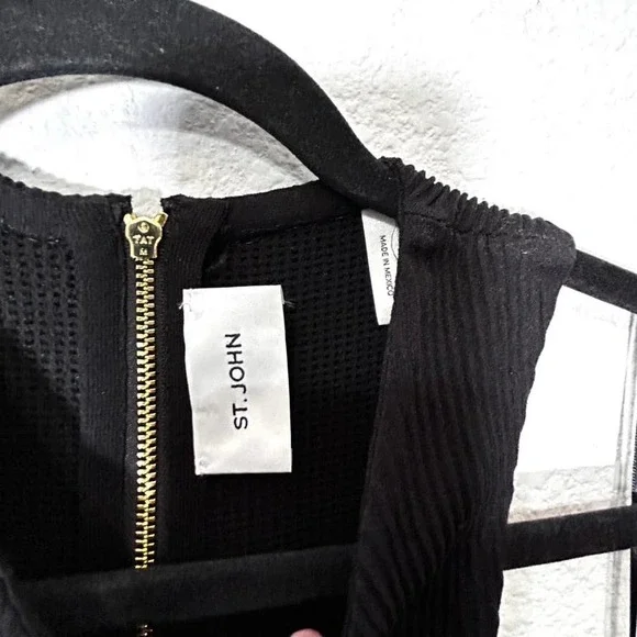 This dress from St. John is sure to become your new go-to LBD. Knit from a midweight blend, the sheath silhouette features a racerback and ribbed paneling that create a sleek look you're sure to love. Full Functional back Zipper down the entire Add your favorite heels and a shoulder bag for an instantly elegant ensemble you can wear anywhere Quite Luxurycan be worn on the red carpet and with chucks.FEATURESBlack Knit DressSleevelessSheath silhouetteMidi hemForm FittingLBDPit to Pit 14" *pre-stretchedWaist 13" *pre-stretchedLength 48"ImportedMinimalist simple modern neutral capsule timeless classy chic French everyday Business office career formal work professional sophisticated event holiday NYE Wedding Guest LBDMATERIAL & CARE tag removedComposition: 83% viscose, 17% polyesterPreloved Excellent Condition No Flaws Minimal Wear.