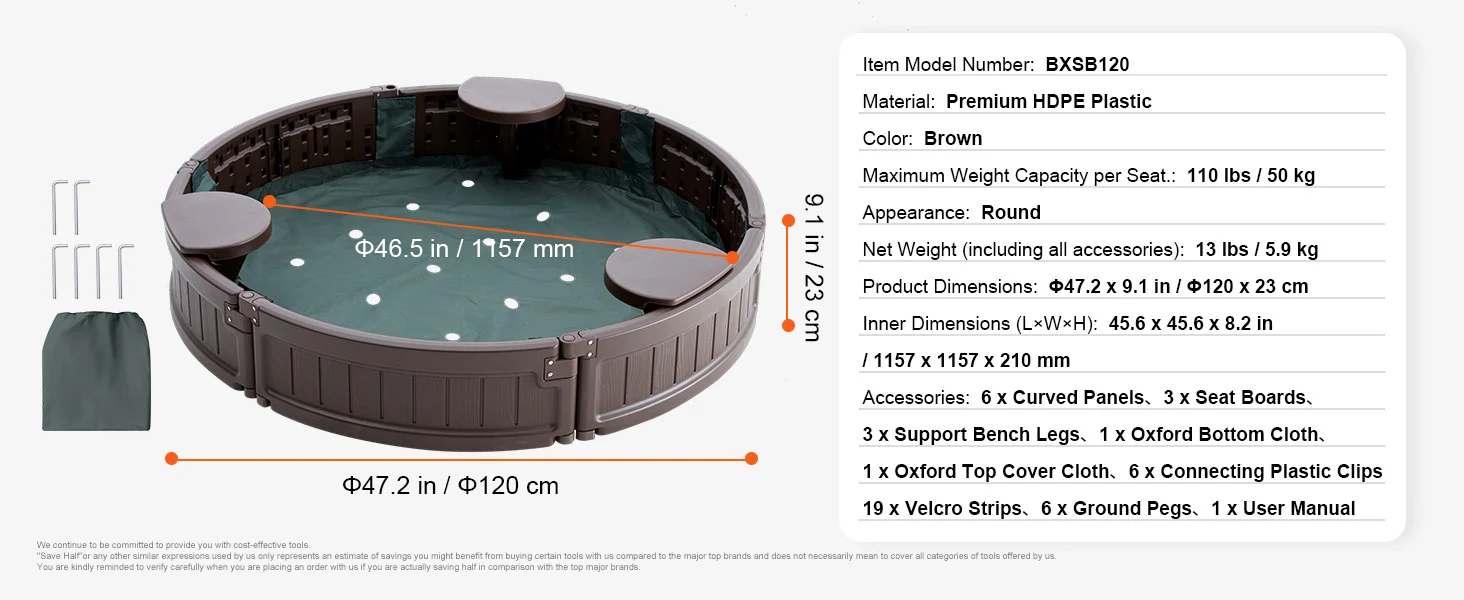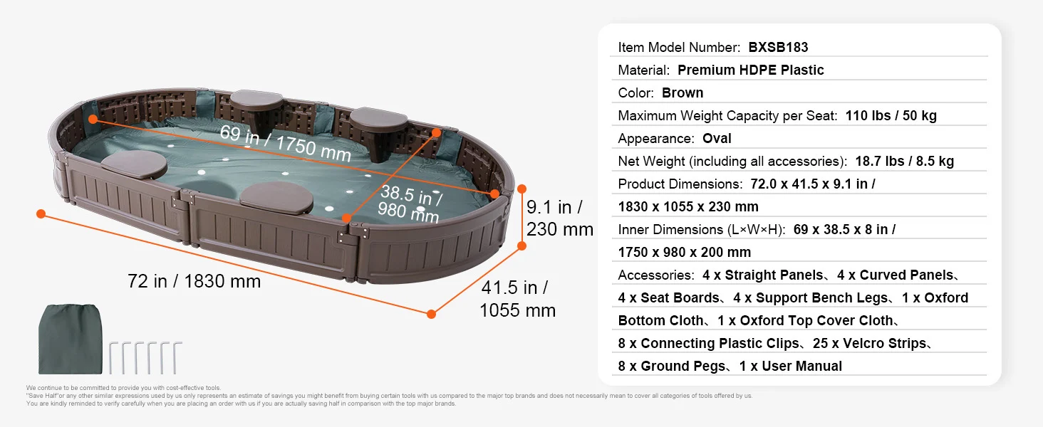 • Weather-Resistant and Durable Materials: The sand box for kids is made of HDPE material, known for its excellent wear resistance and weather resistance, and has undergone rigorous environmental testing to ensure the health and safety of children. The sand cover and bottom are made of Oxford cloth, which can withstand various outdoor weather conditions. Note: The product does not include play-grade sand and toys.