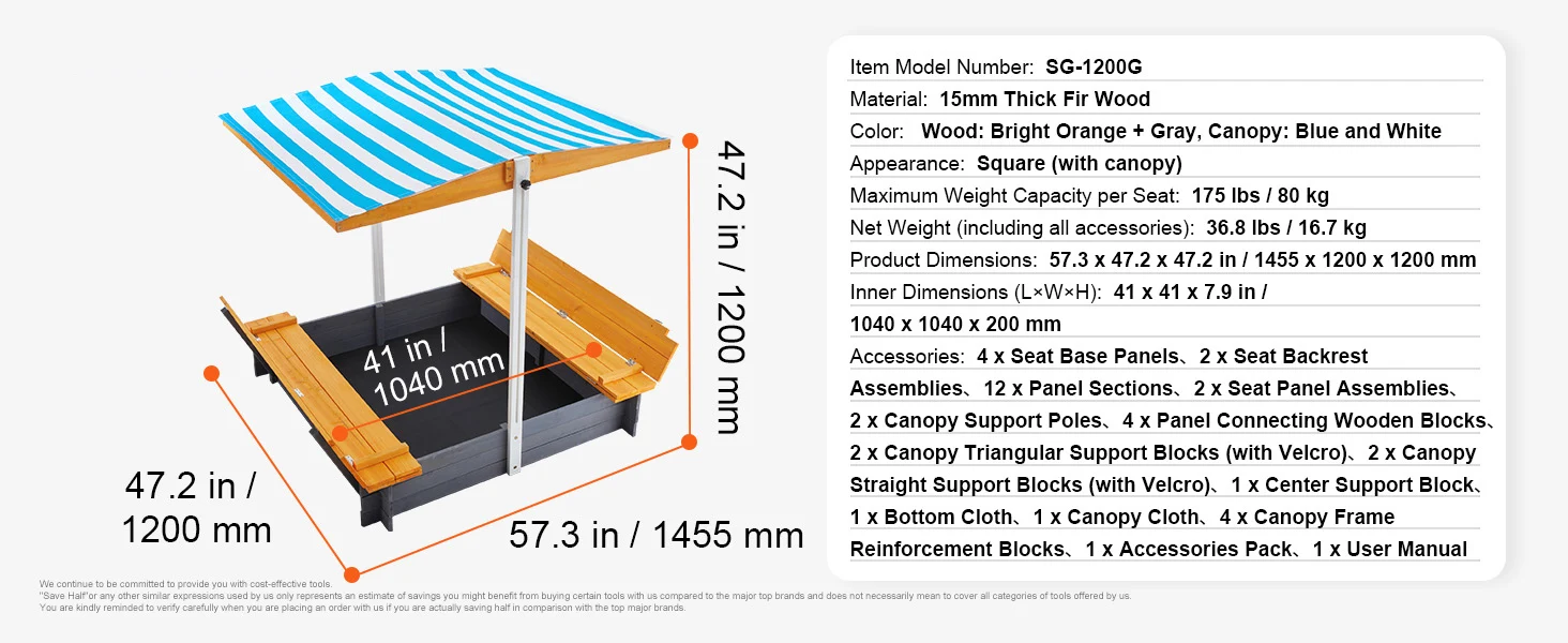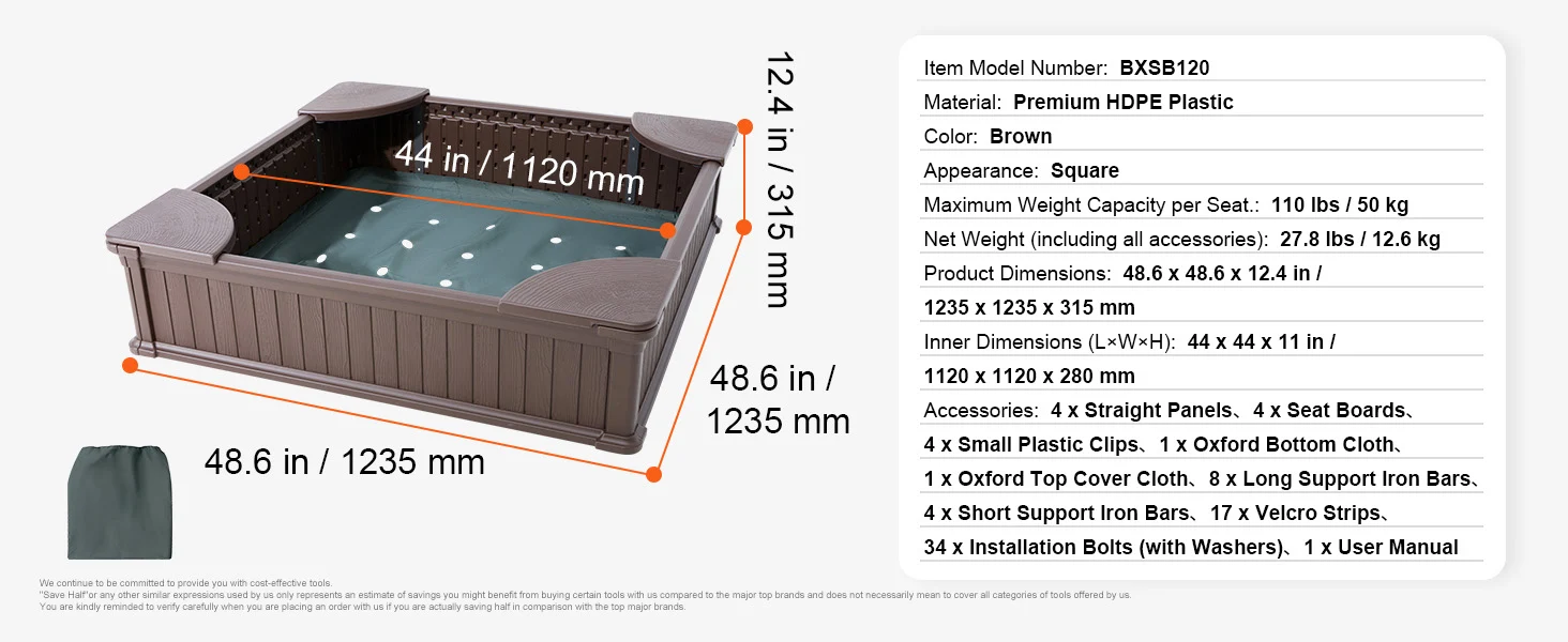 • Children's Mini Playground: Our sand box is not just a play area but a place where happy childhood memories are made. With a size of 48.6 x 48.6 x 12.4 in / 1235 x 1235 x 315 mm it can accommodate 2-4 children playing together, turning your backyard or outdoor play area into a playground filled with exploration and laughter.
