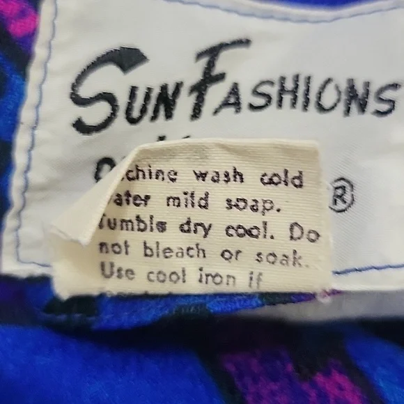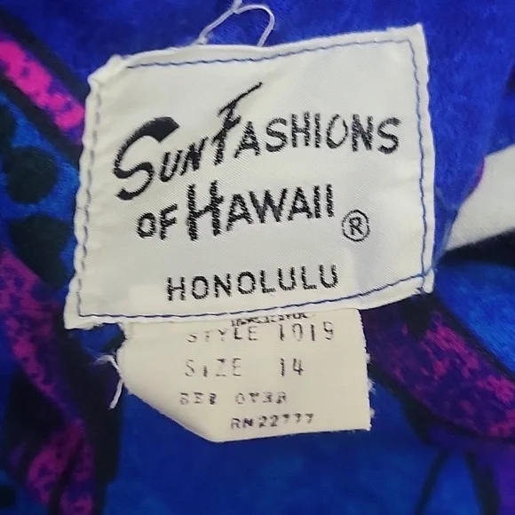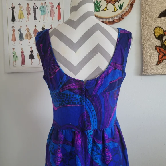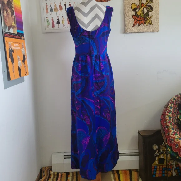 Labeled size 14, runs a lot smaller than a modern 14 & the measurements come out to a modern 8-10 in my opinion. Check the measurements though & let me know if I can get any other info for you.• Pit to Pit: About 18"• Waist: About 15.5"• Length: About 55"This dress is a true piece of art & one of the most beautiful things I have ever seen.100% acrylic, it's flexible & lightweight & feels a little fuzzy in the outside.Royal blue, A-line maxi dress with a very swirly abstract paisley print in violet, pink & blue.Sleeveless. Scoop neck.Thick waistband with decorative buttons.No flaws.Styles: hawaiian hawaii vacation resort tropical 70s bright fun summer warm gorgeous hippie 69s groovy psychedelic glam travel jetset island unique