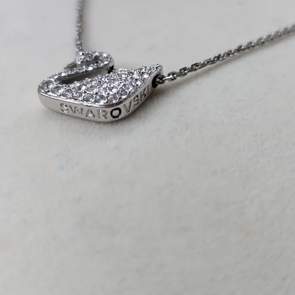 Swarovski Swan Stamped Rhodium Plated Necklace - Good ConditionComes in a non- Swarovski boxOne of the stones on the front has a tiny tiny of green. The Swarovski letters on the bottom used to be black but faded. The back has faint scratches. None of these are noticeable when wearing.16.5-19" adjustable chain