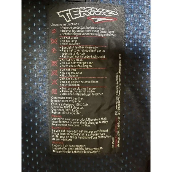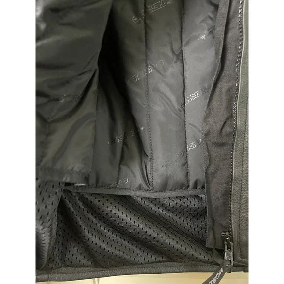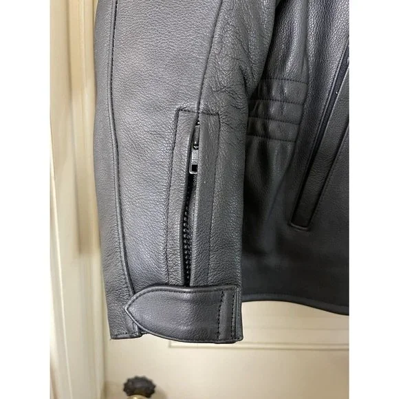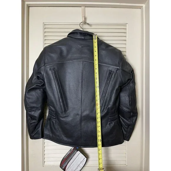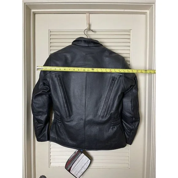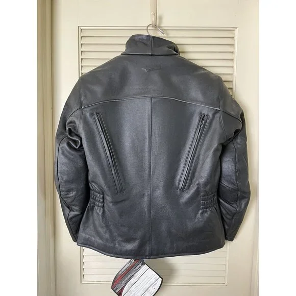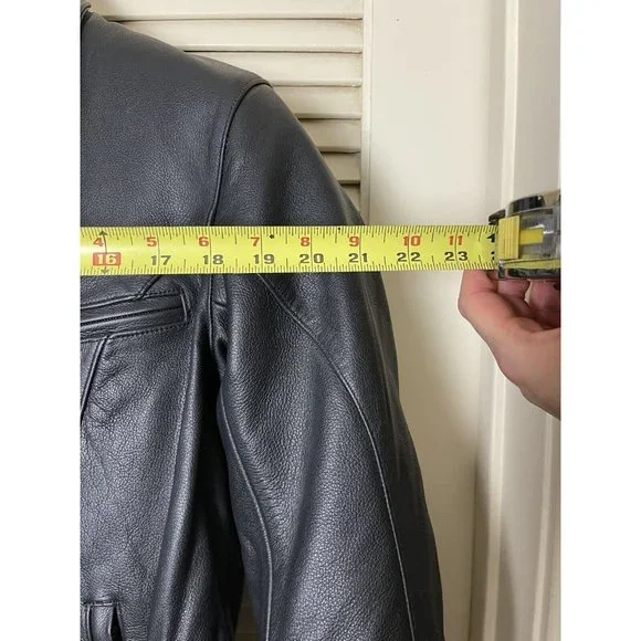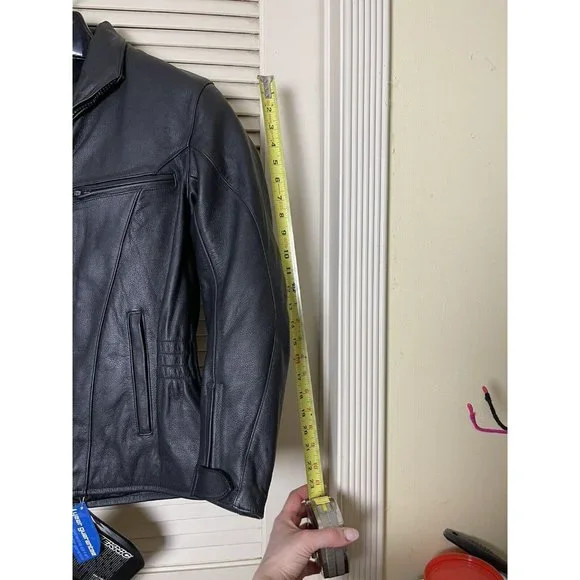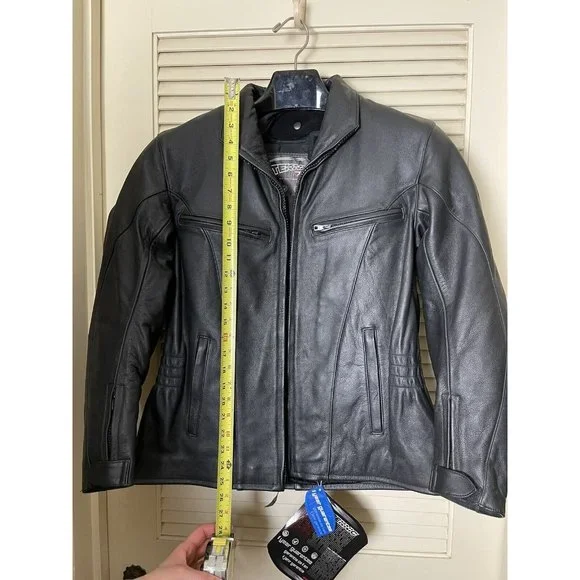 Well, my (ex) husband bought a motorcycle. I bought the best jacket that I could find. I decided to divorce the ***, so I never had the chance to wear it. So here's your chance to buy a fantastic, stylish motorcycle jacket. It has armor to protect you but the armor and lining are removable. The leather is thick and will provide great protection. This coat weighs close to 8lbs.Style No. 201-205071Outer shell 100% LeatherInterior 100% Polyester