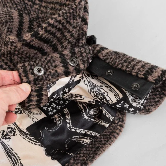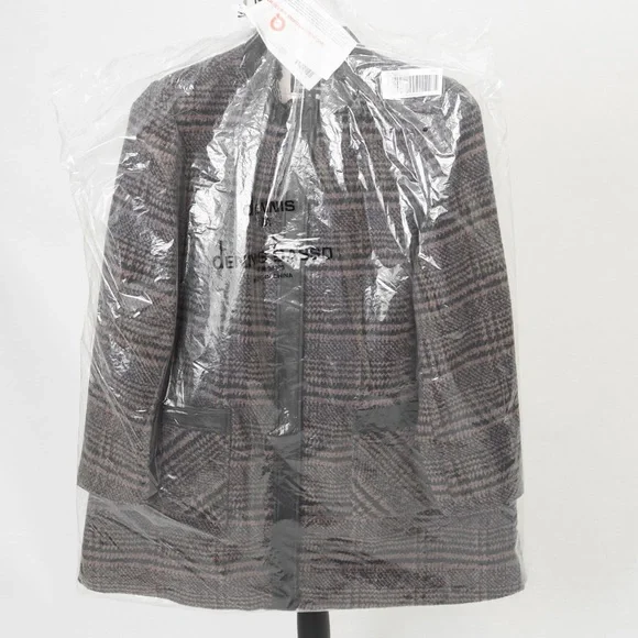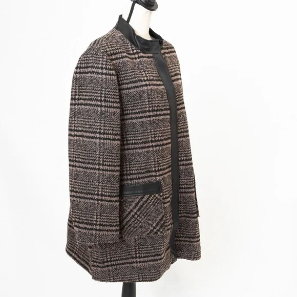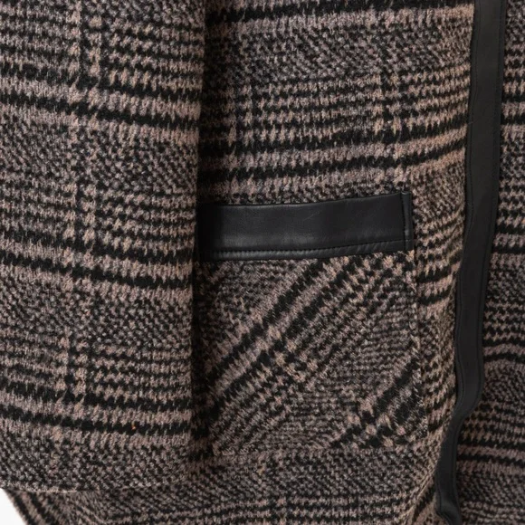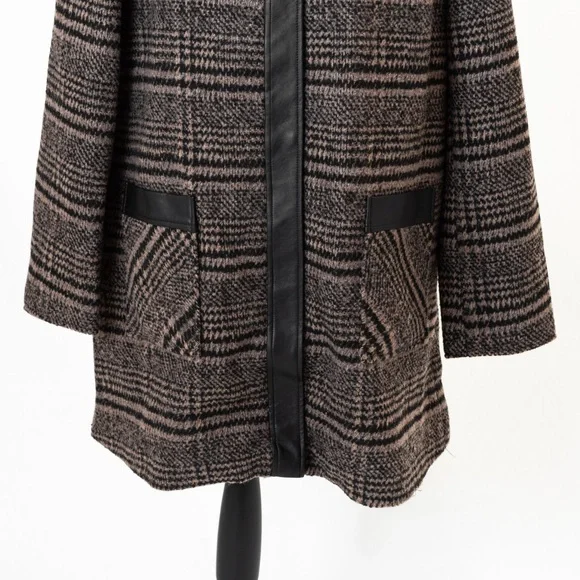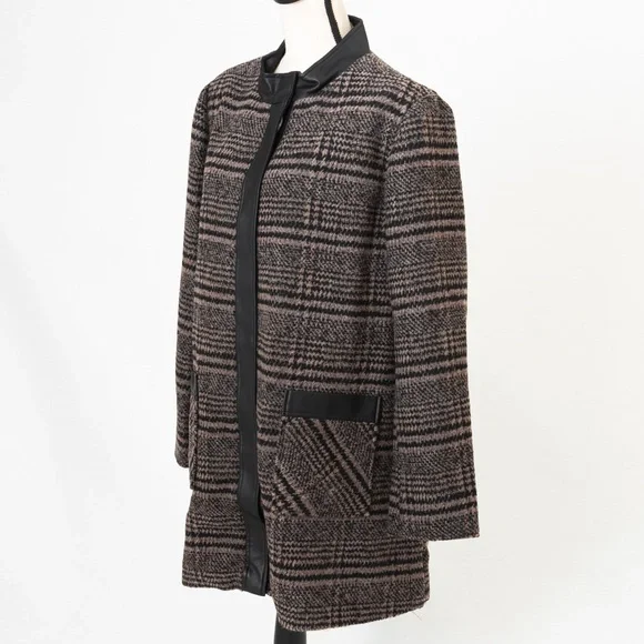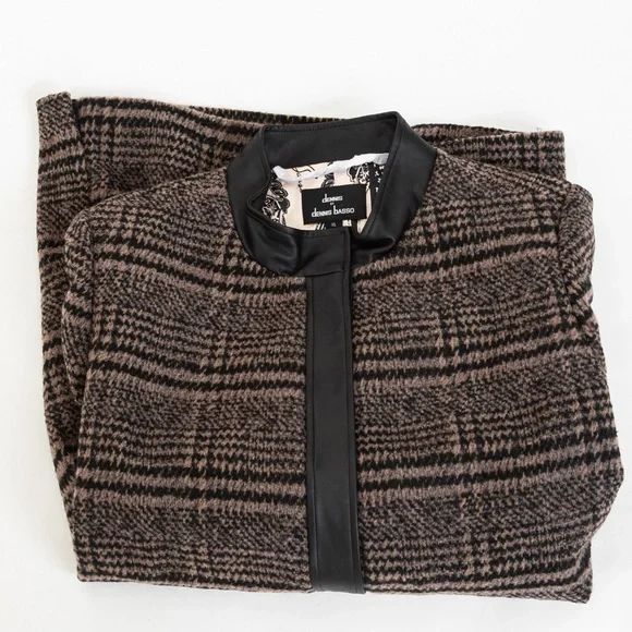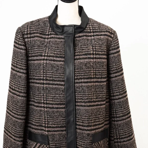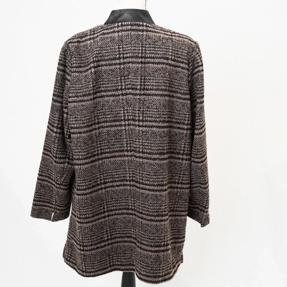 Neutral deep taupe & black tweed plaid checked thigh length jacket with black vegan leather trim zipper front with matching scarf in size XL from Dennis Basso timeless classic preppy winter fashion PlaidCheckedPlaid jacket TweedTweed jacket Timeless Classic Faux leather Vegan leatherFaux leather trim Stand collarStraight collarMatching scarf ScarfScarf can be worn as traditional scarf or s a belt on coat or pantContemporary ModernWinter fashion Fall fashionWinter coatNeutral Neutral fashion VersatilePreppyPreppy fashion Dennis BassoDennis Basso jacket New with tags, packaging, & coat bag - never worn Purchased from QVCArmpit to armpit (flat lay) - approx 25”Armpit to end of sleeve - approx 17”Top of collar (back) to bottom - approx 34”