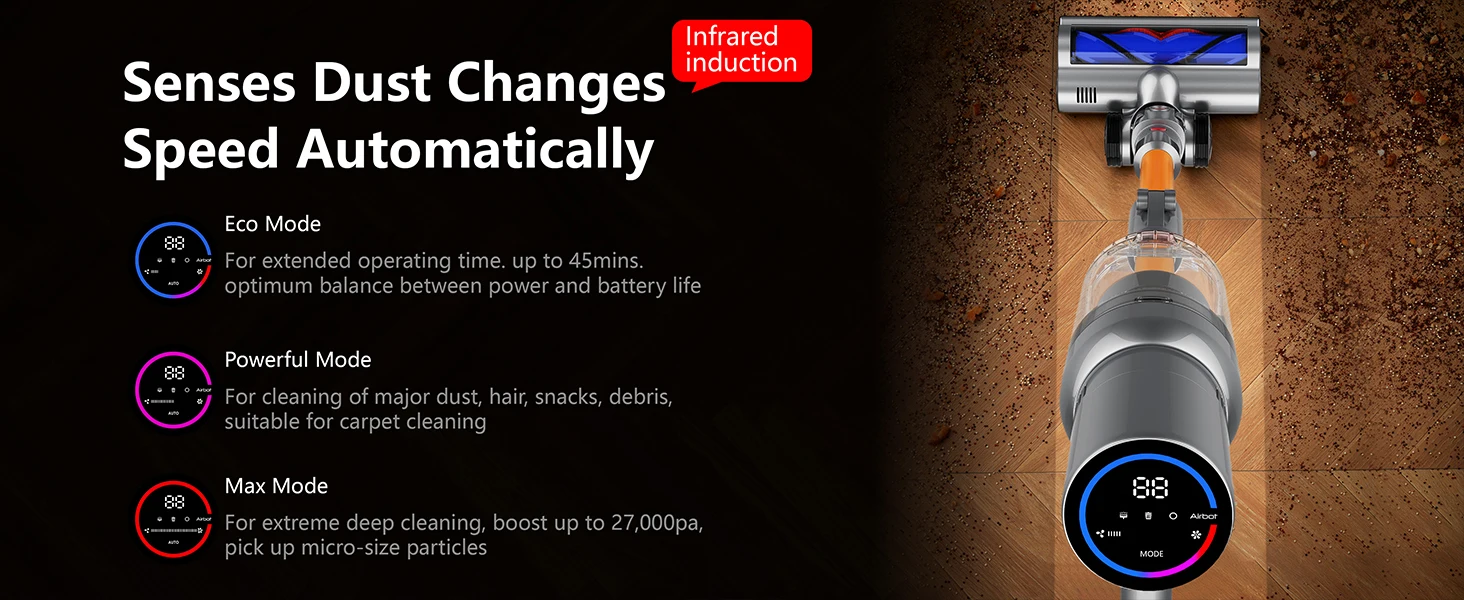Infrared sensors automatically boost suction to 27,000Pa for stubborn debris, then reduce power for dust maintenance.
