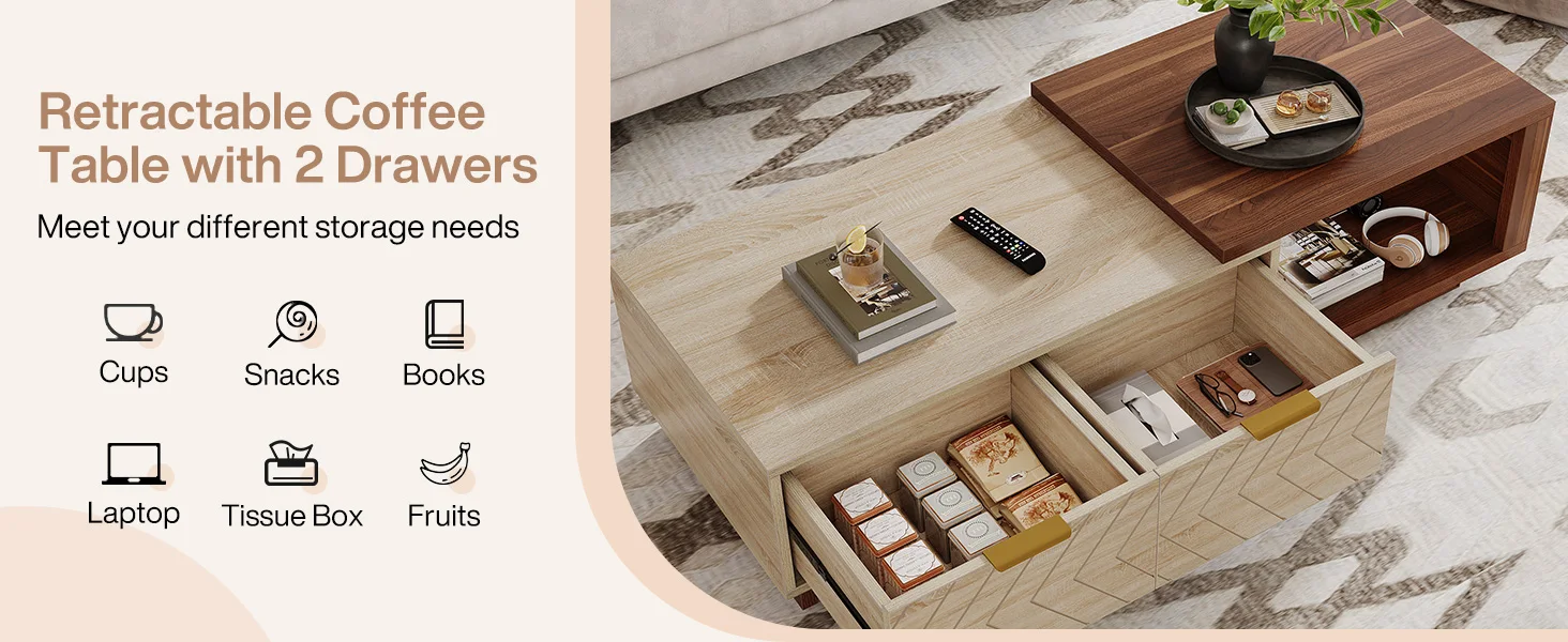 Expandable Design: Offering unrivaled versatility, this coffee table features an expandable design that enables you to customize its width to suit your space requirements. Whether placed beside your sofa or in the living area, this table accommodates various spaces with ease. With its additional open shelf space after extension, you can conveniently access your frequently-used items, making this coffee table not only stylish but also practical.