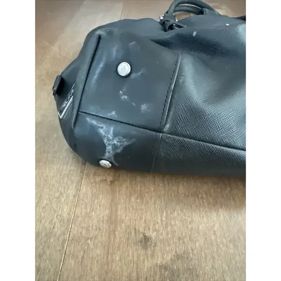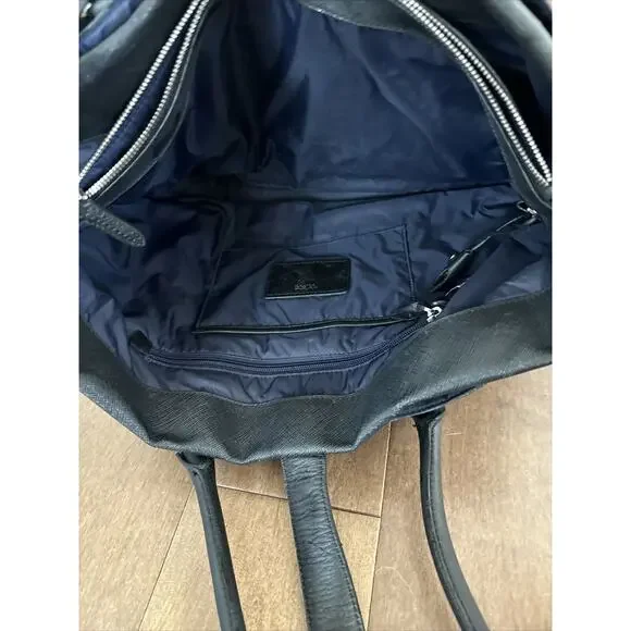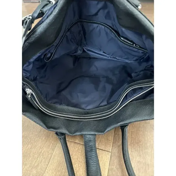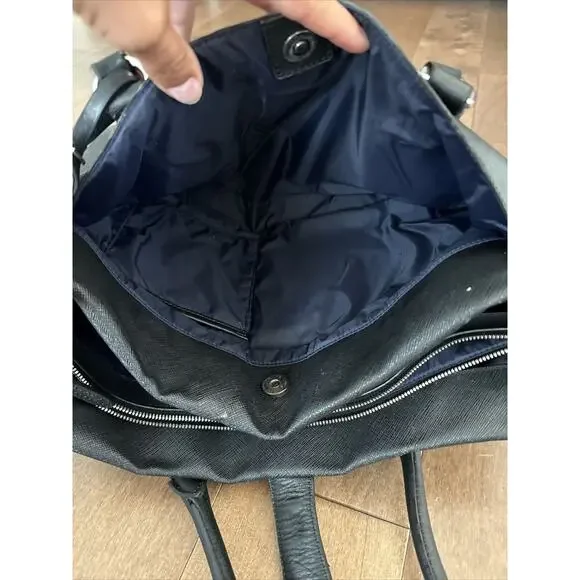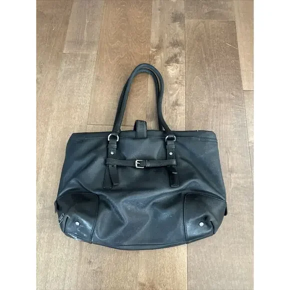 This TUMI tote is a stylish and sophisticated business bag that is perfect for the modern woman on the go. Crafted from high-quality black leather, this vintage piece features a secure locking mechanism and comes with multiple closures including zip, magnetic, and buckle. The spacious interior is lined with black fabric and comes equipped with various pockets for all your organizational needs. Additionally, the adjustable leather strap ensures that you can carry it comfortably for extended periods of time. Make a statement with this timeless piece that exudes class and elegance.17x12”No keyHas scuffs/marks