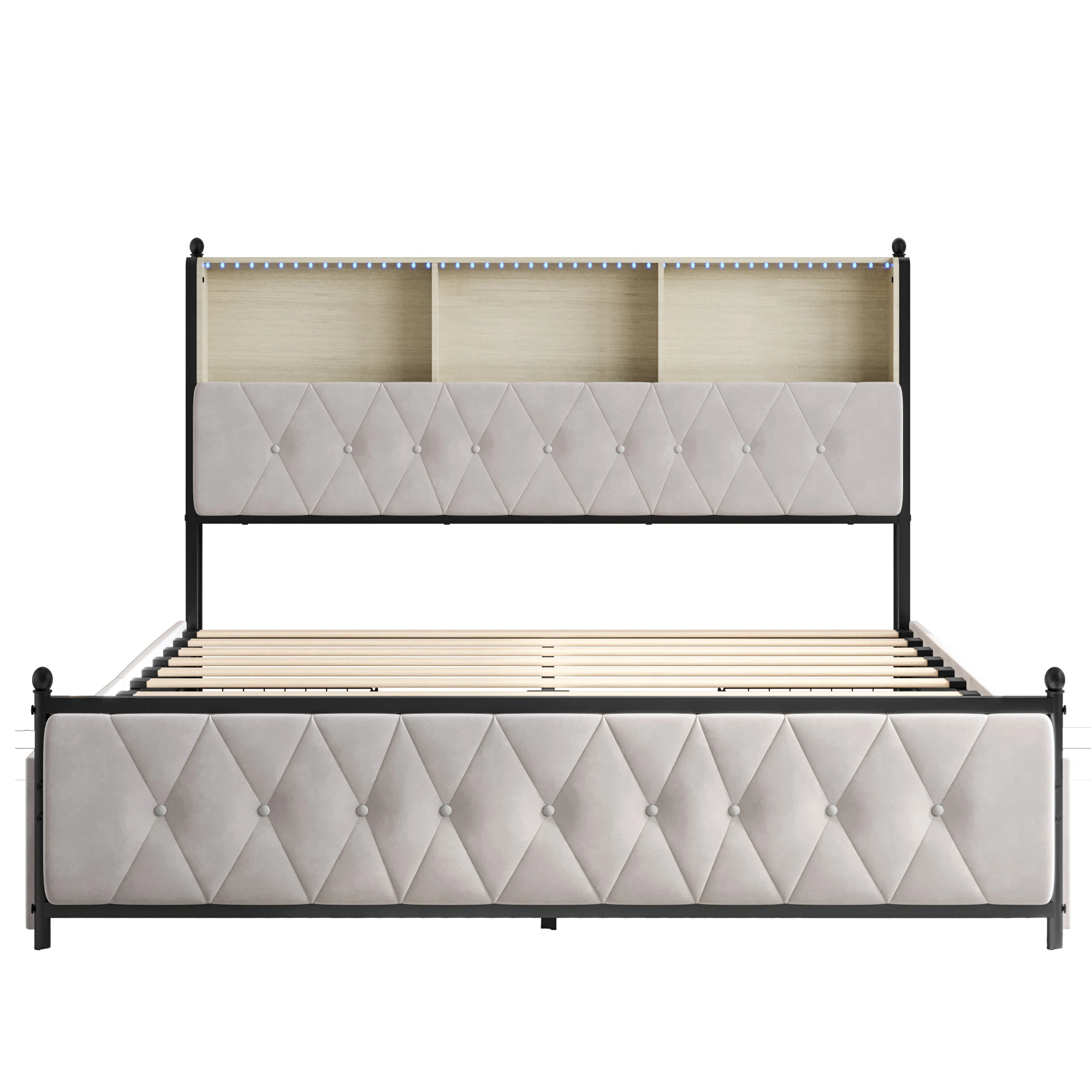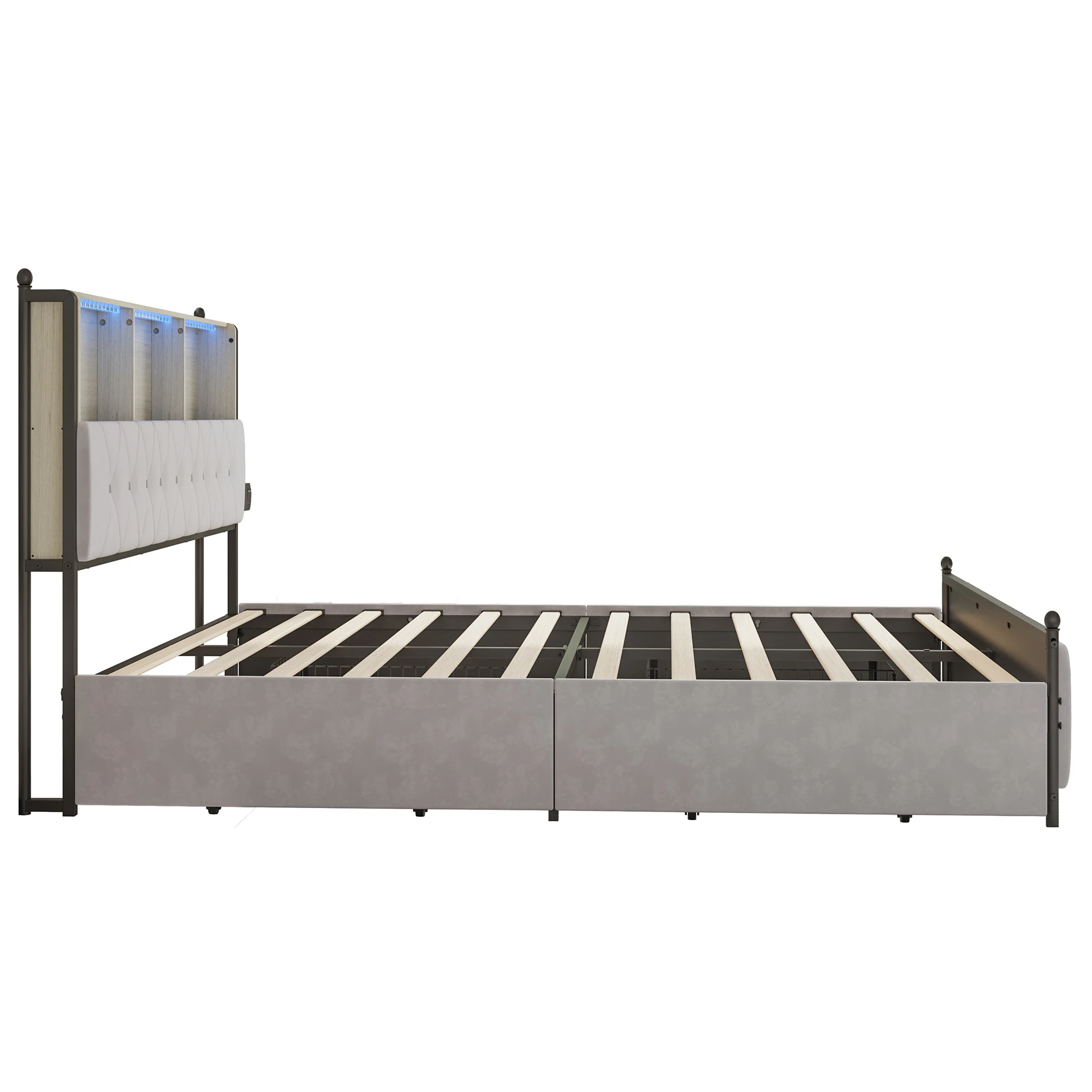 3.Charging function for modern convenience: This storage bed has USB and Type-C charging ports that allow you to charge devices such as smartphones, tablets or laptops at the same time. The innovative headboard makes this upholstered bed a practical companion in your everyday life.
