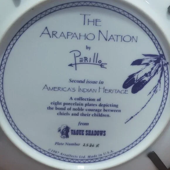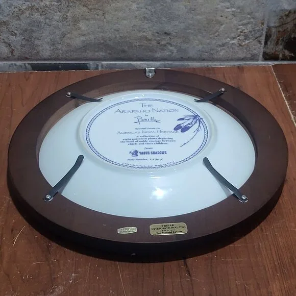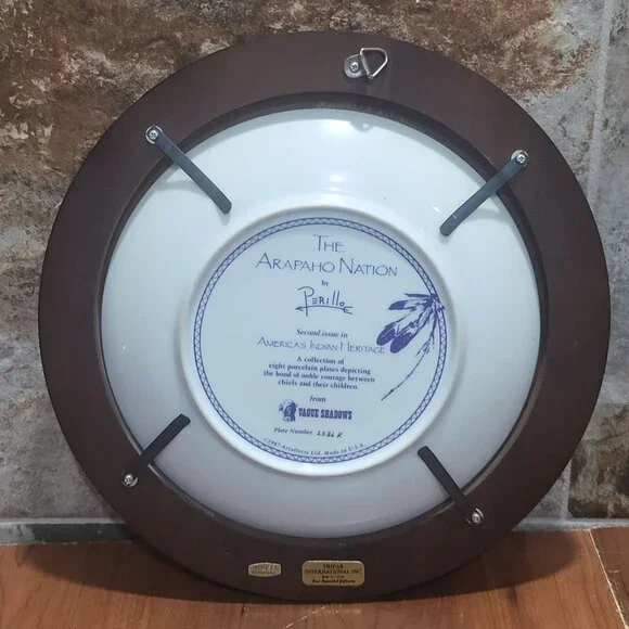 Vague Shadows The Arapaho Nation Decorative Collector Plate by Perillo Second Issue Americas Indian HeritageSuperficial scratches on wood frame, see photos 8, 9, 10.Vintage from the 1980sMeasurement: 10.75 x 1.75 x 10.75 inWeight: 1 lb 12 ozYour item may come in a re-used box with some labeling from other companies In my effort to recycle and re-use. Thank you for supporting my small business.Features:• Decorative CollectorPlate• TaiwanCondition: Pre-Owned GoodSuperficial scratches on wood frame, see photos 8, 9, 10.