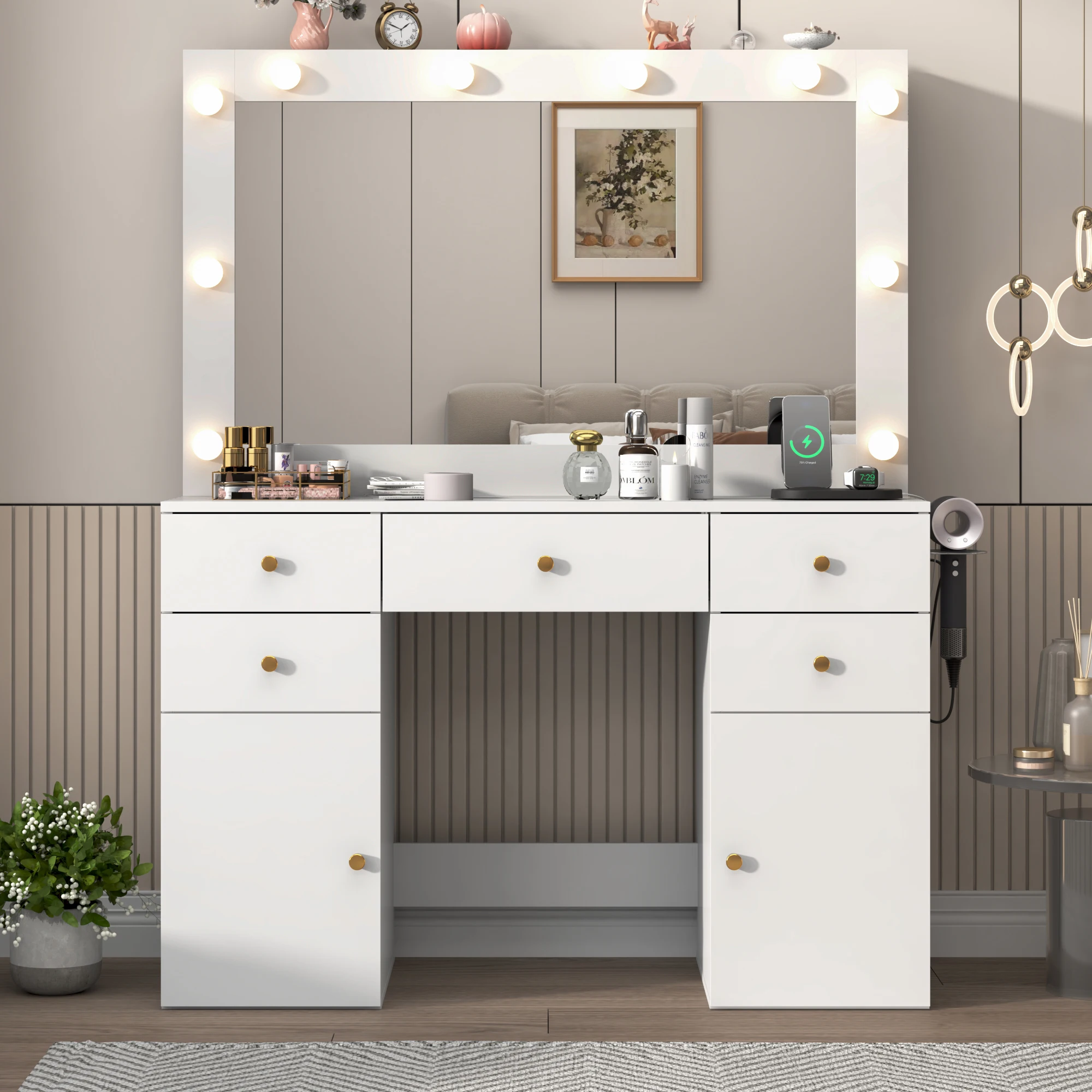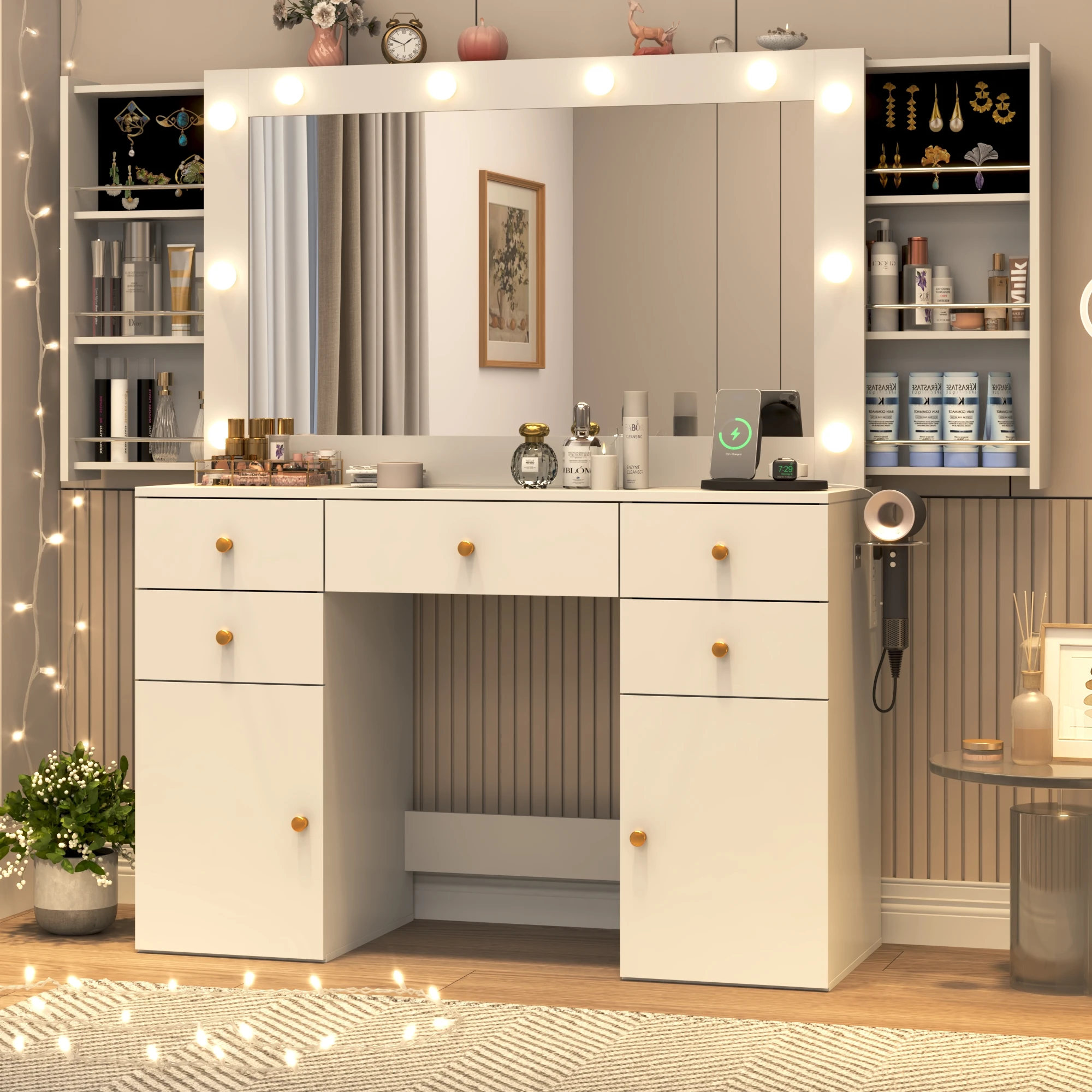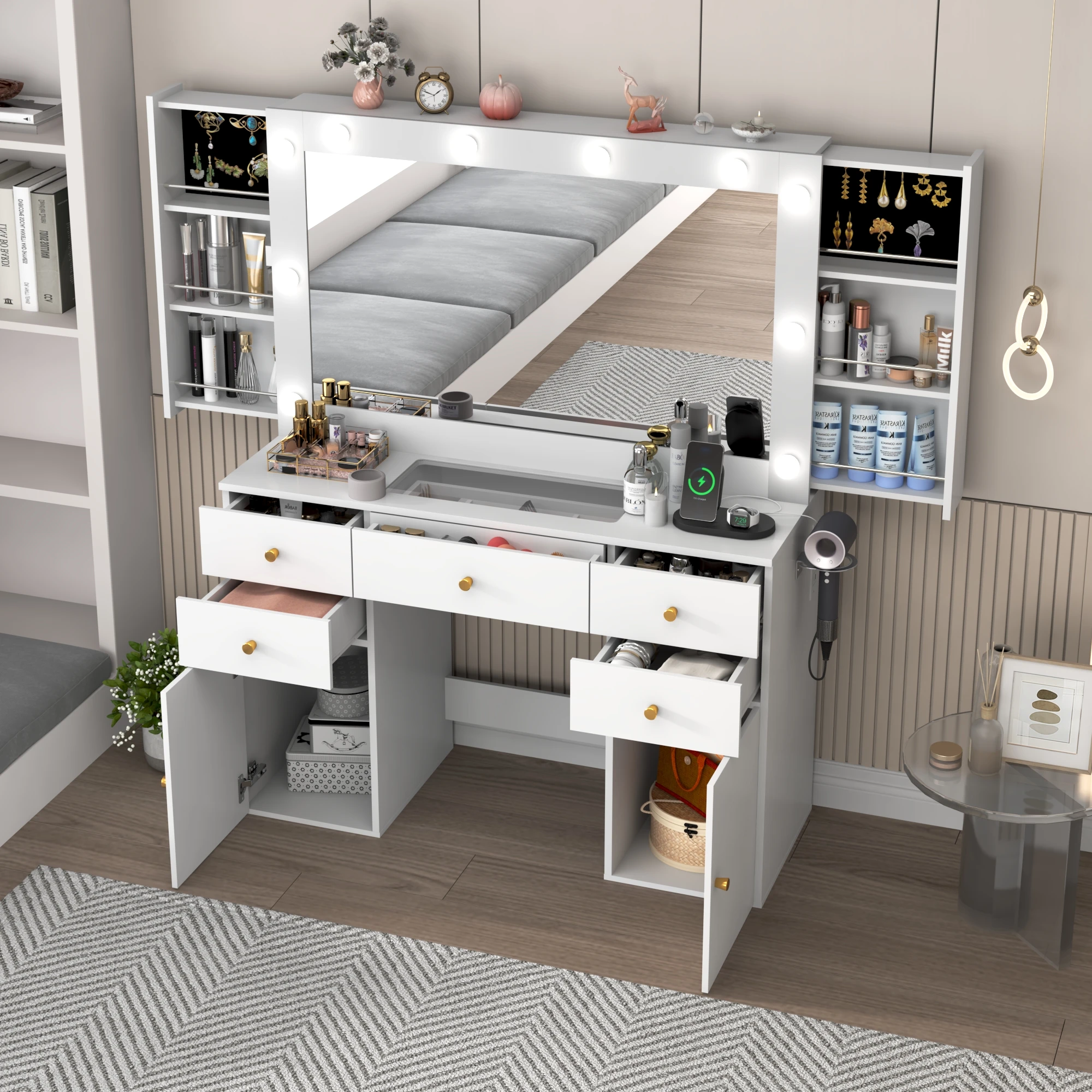 • 【Plenty Storage Capacity】The makeup vanity features a large desktop, 5 drawers and 2 cabinets with doors. There are 2 slide-out wall-mounted jewelry storage and 4 open shelves behind the mirror, which can easily accommodate cosmetics, jewelry and other beauty supplies, making your makeup environment tidy and organized.