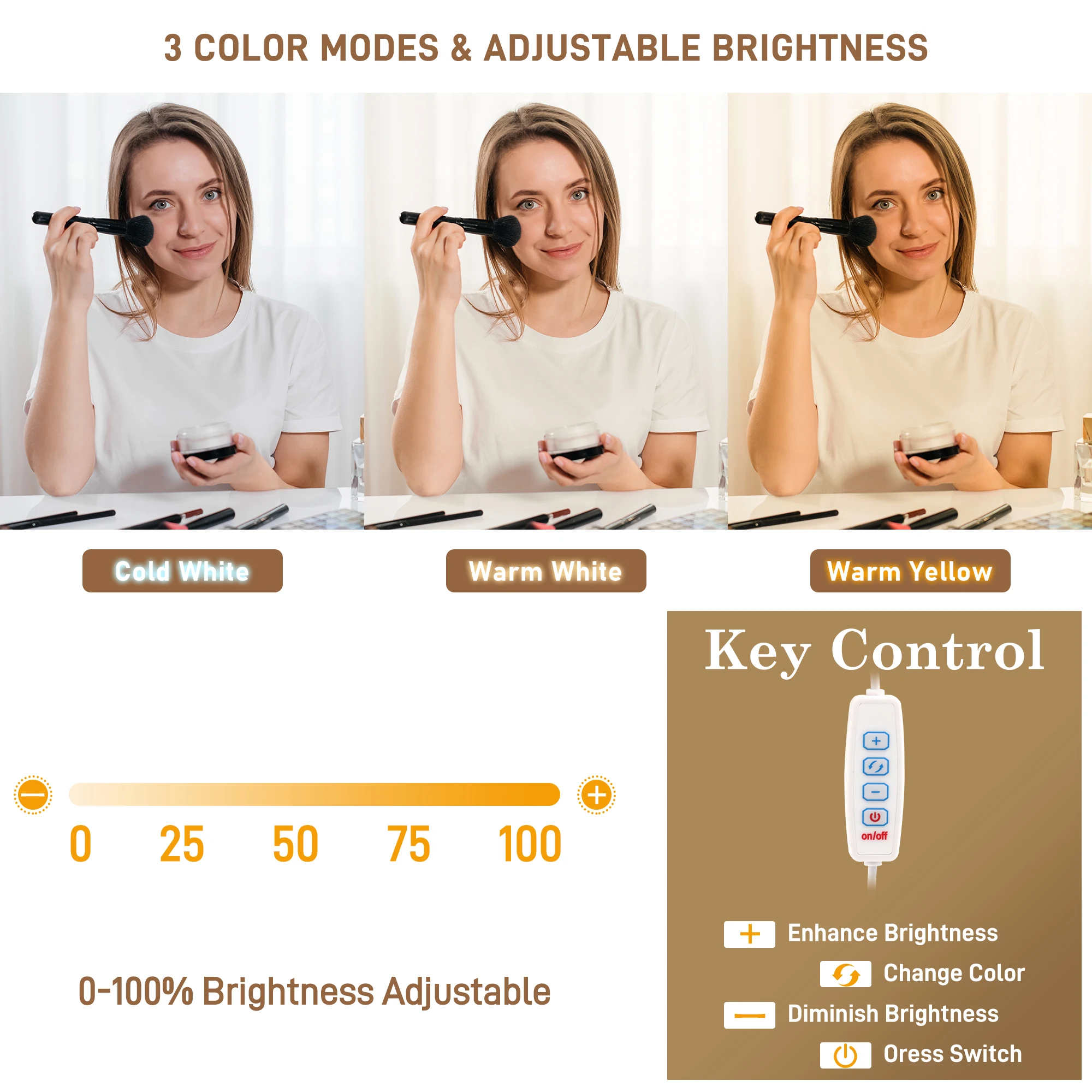 • 【Vanity Mirror with 3 Color Light Modes】The large mirror on the vanity desk has 10 LED bulbs, and the light can be switched to 3 colors (cold white, warm white or warm yellow), and the brightness can be adjusted to adapt to different scenes. The clear mirror provides professional services for your makeup, hairstyle and taking pictures.