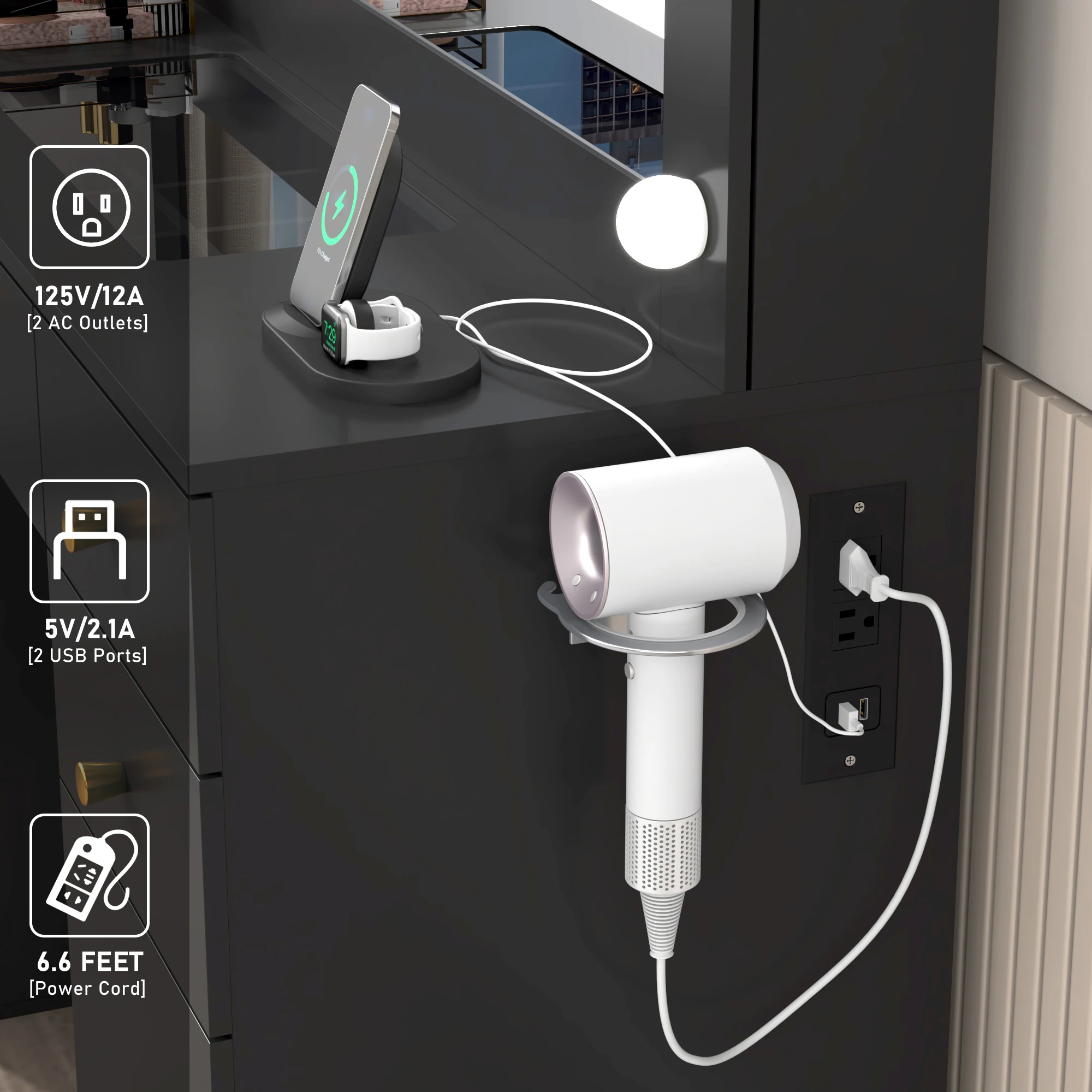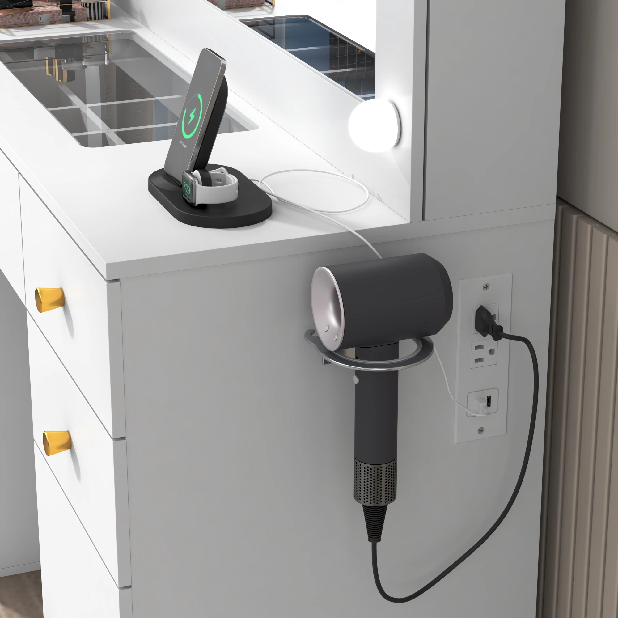 • 【Vanity Desk with Charging Station】The vanity table is equipped with a built-in charging station, which includes 2 standard plug sockets and 2 USB ports, In addition, our vanity desk provides you with a hair dryer rack to keep your hair dryer and hair curler within arm' s reach.