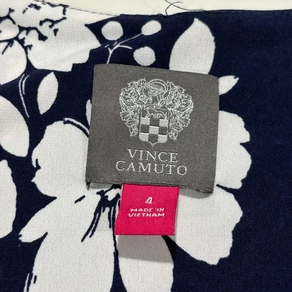Vince Camuto Navy orange pink Floral Print Faux-Wrap Dress Size 4Vince Camuto navy and white floral faux wrap dress accented with vibrant orange and pink stripes around the hem.-faux wrap style-short sleeve-v-neck-elbow-length sleeves-knee length or just above depending on your height-stretch-pullover styling-machine wash/dry cleanExcellent Check out my other listings and bundle to save $$$! I recycle, so you’ll get your items in recycled packaging to help our planet♻️🌎