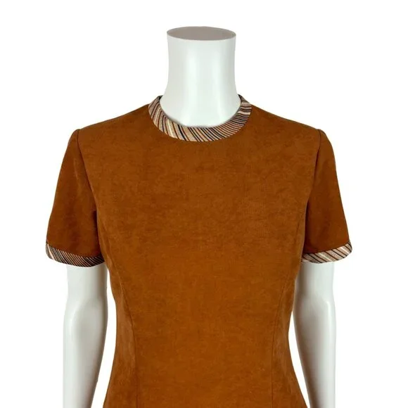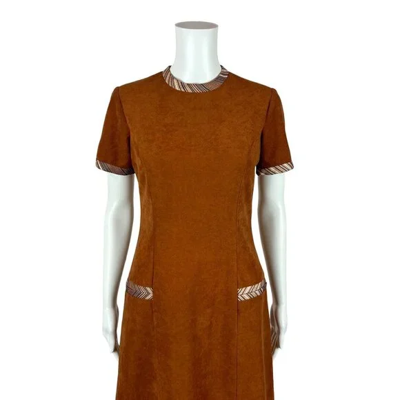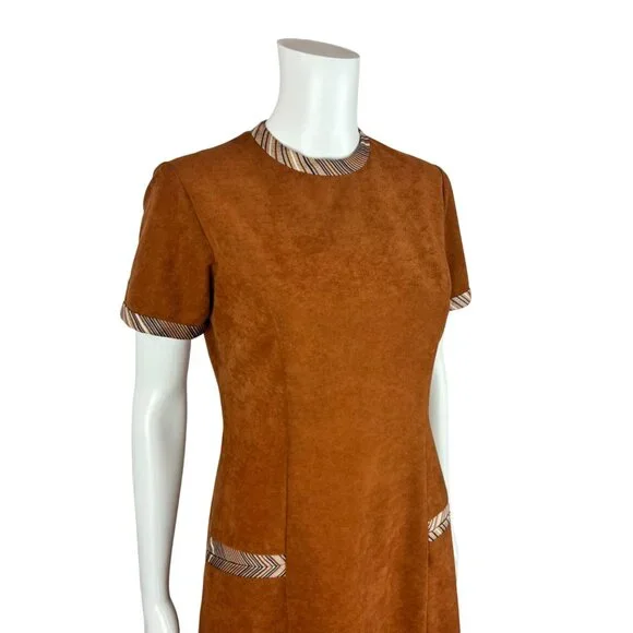 Vintage 70s Mini Dress Women's Small Brown Faux Suede Short Sleeve Shift BohoDress zips up the back.LABEL: Union TagFABRIC: 100% PolyesterMARKED VINTAGE SIZE: -SHOULDERS: 14.5"BUST: 35"WAIST: 30"HIPS: 34"LENGTH: 38.5"CONDITION: excellentPINNED TO MODEL?: no☝For reference Mod's measurements are S 11", B 32.5", W 24", H 32.5"☝
