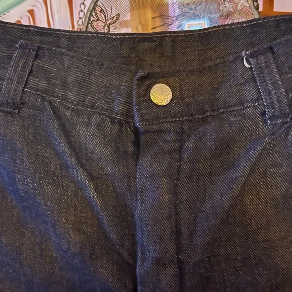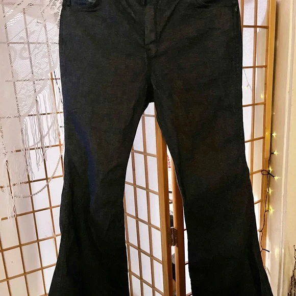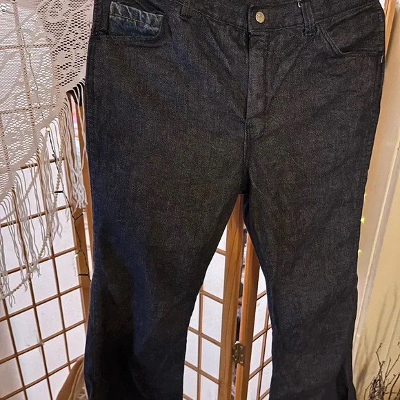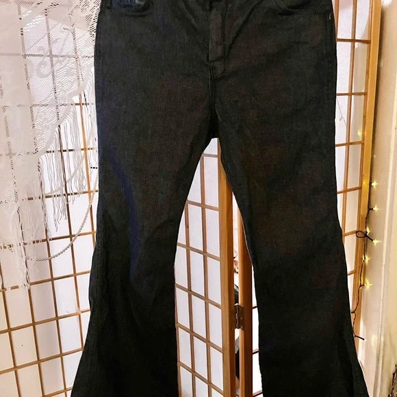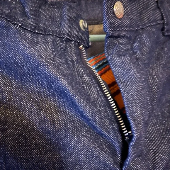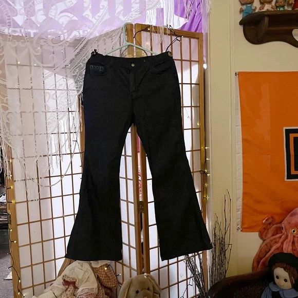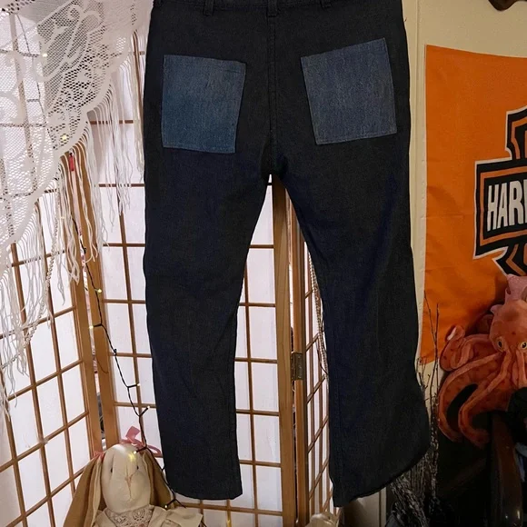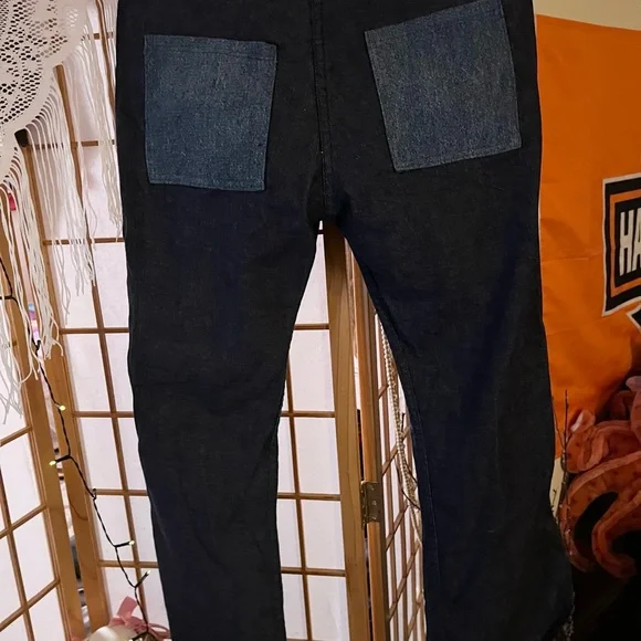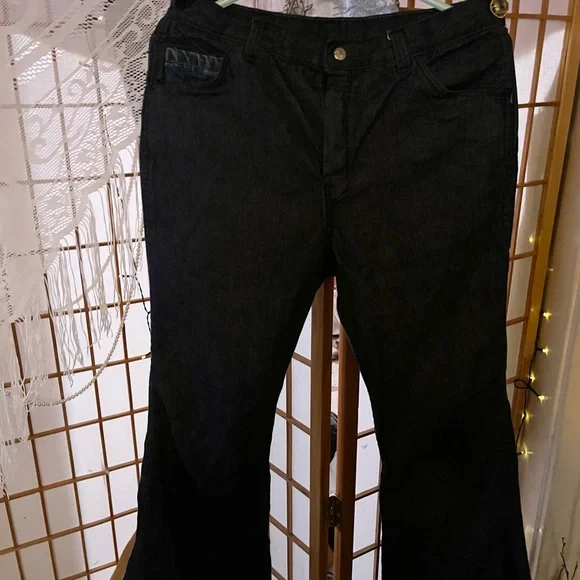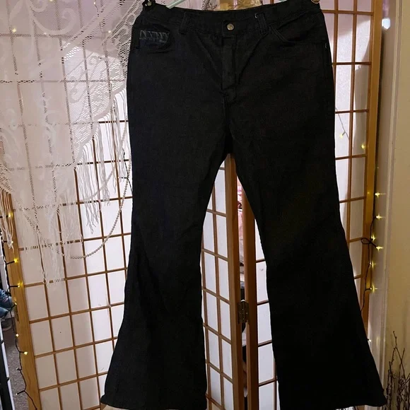 These Absolutely Gorgeous cool Mens Hippie Bell Bottom Jeans are HAND MADE,NEVER WORN!!! I am not quite sure on the size they appear to be a men’s size 31’ by 30’. I am just guessing because my Husband is the same size and I compared a pair of his jeans with these. These are in excellent condition for their age!!! I believe these to be late 70s to early 80s.