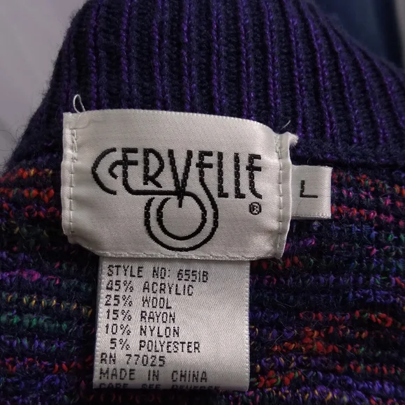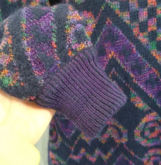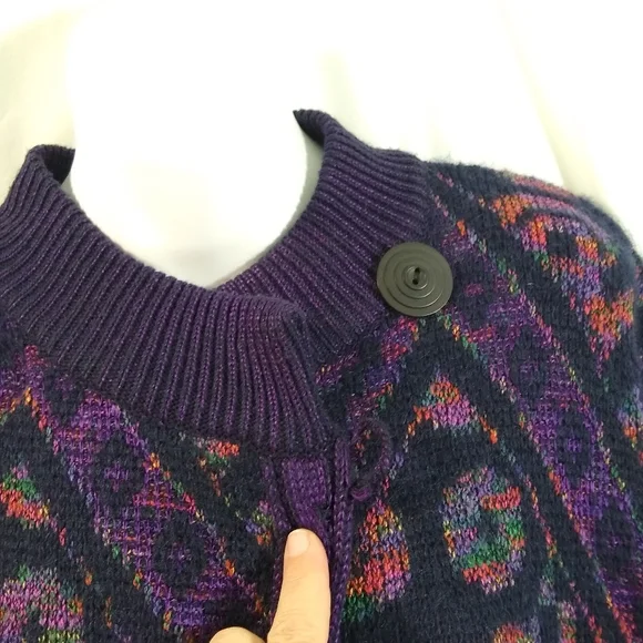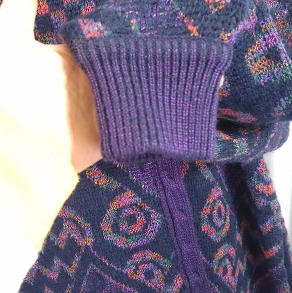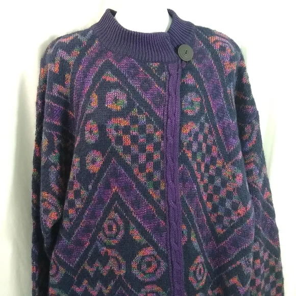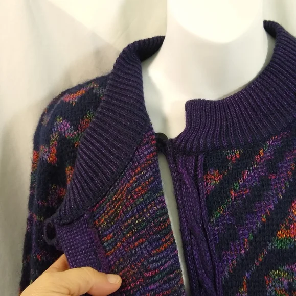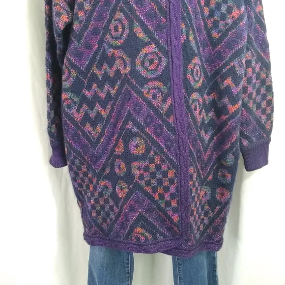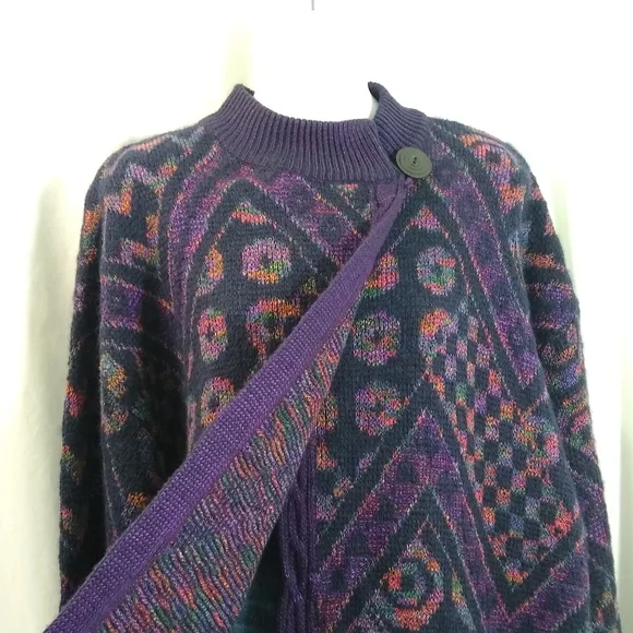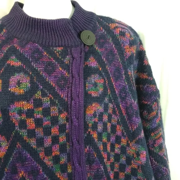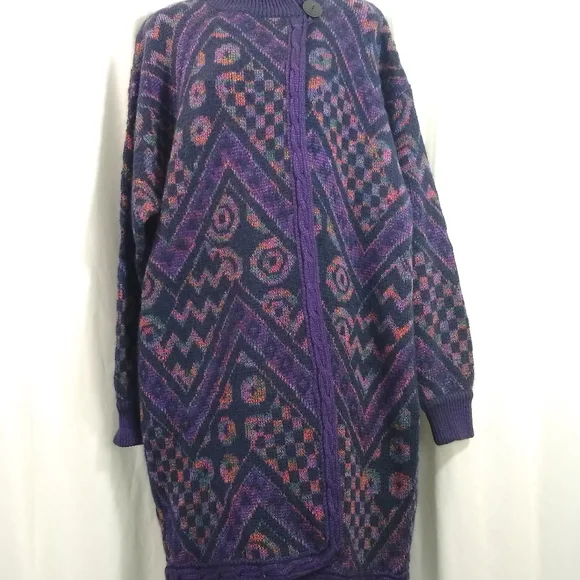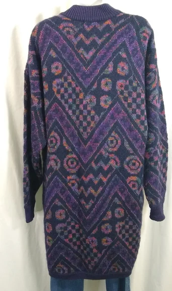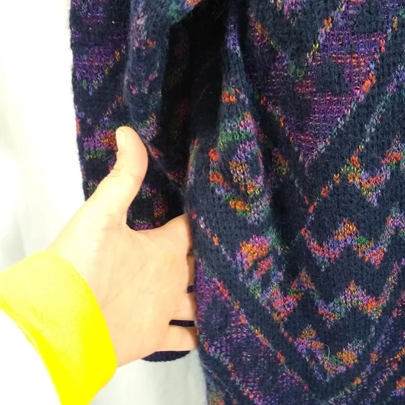 This cardigan is just AMAZING!!!Navy blue with retro patterns: zig zags, circles, checkers, chevrons in a rainbow of colors.Long length, wool blend and heavier weight knit make it a great seasonal transition piece.Ribbed cuffs and collar. Pockets.Crosses over and buttons at neck.Excellent vintage condition.Size LargeMeasures approx while flat and unstretched: 24" bust and 39" length