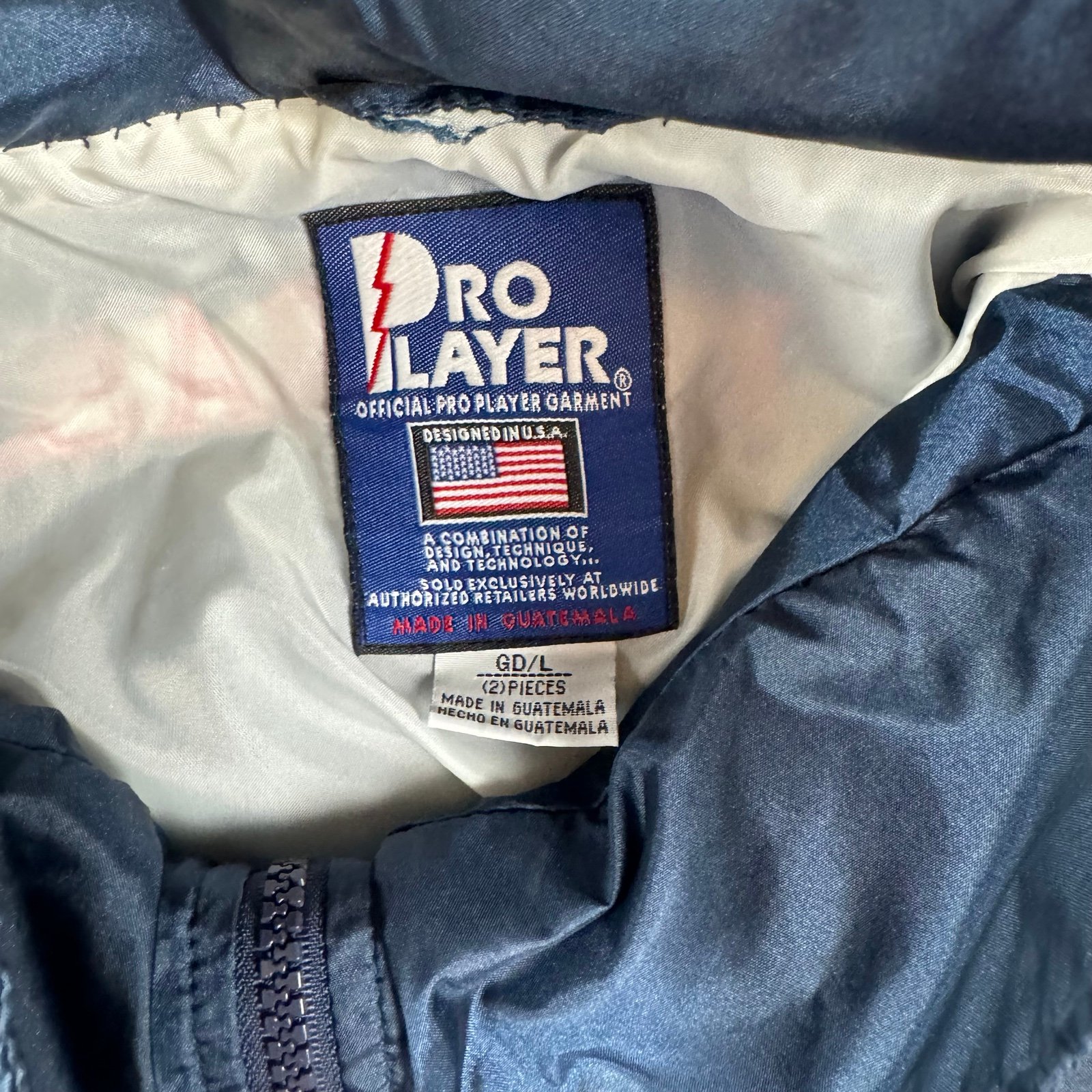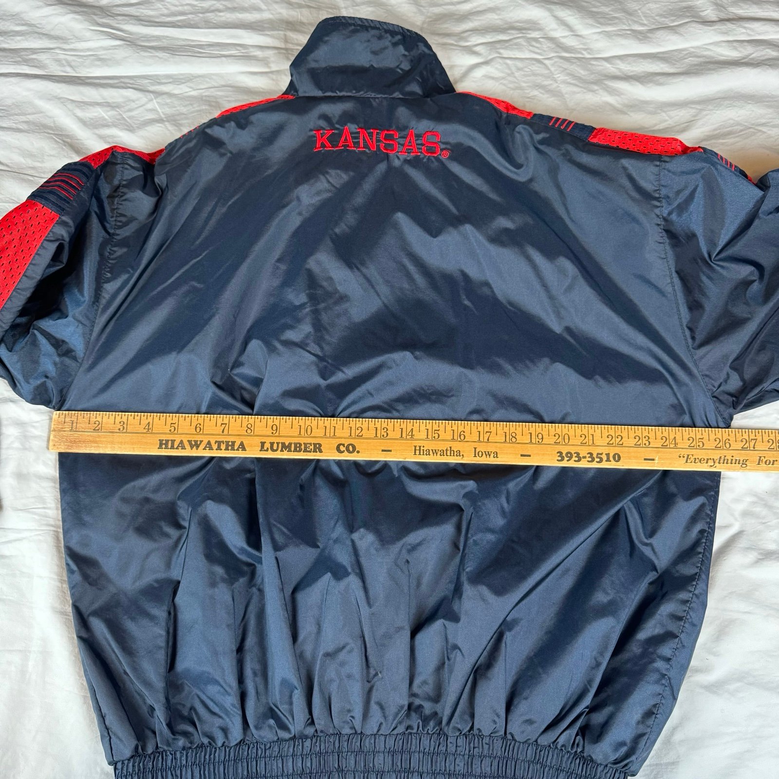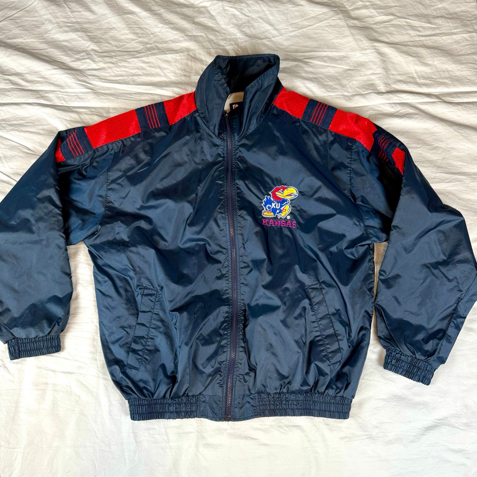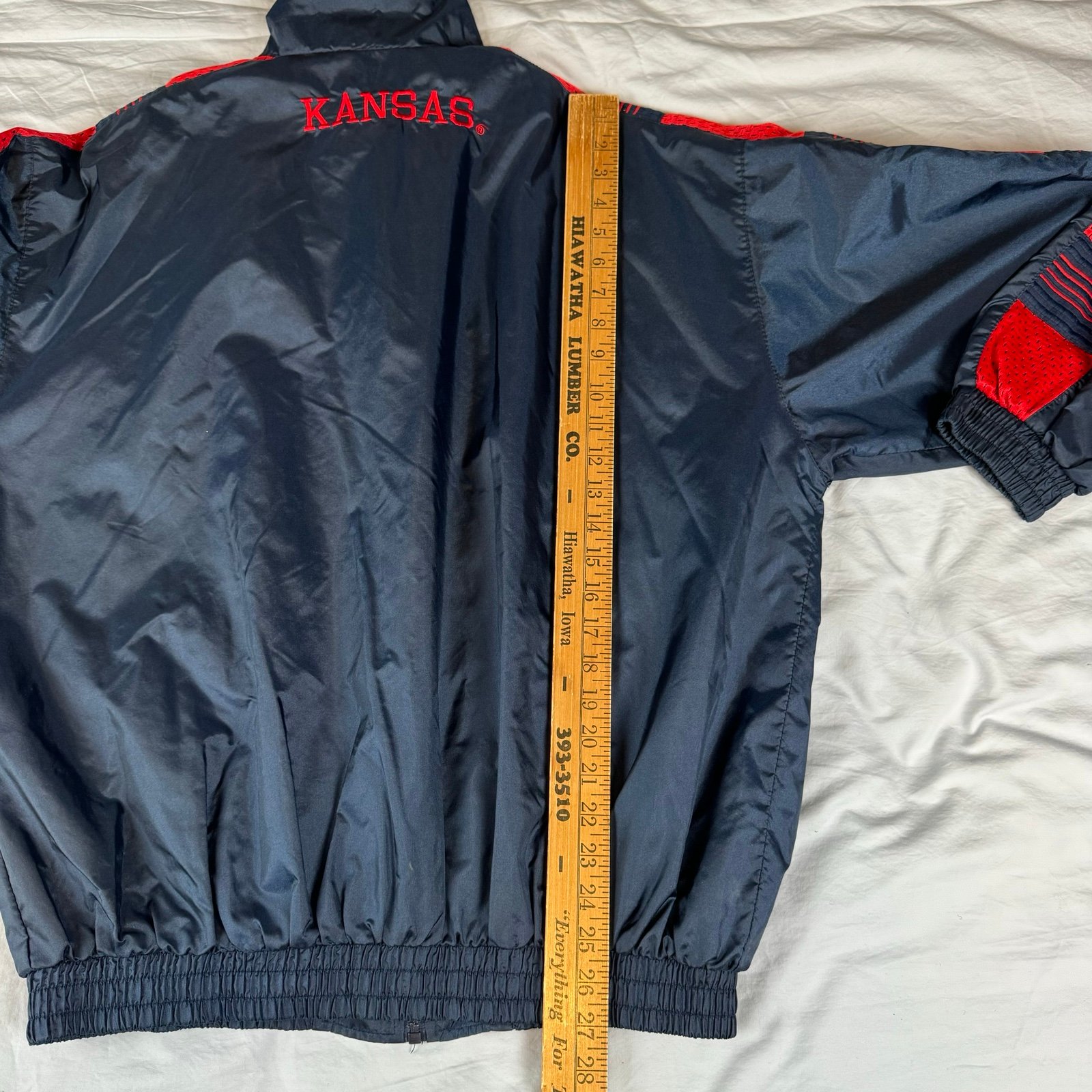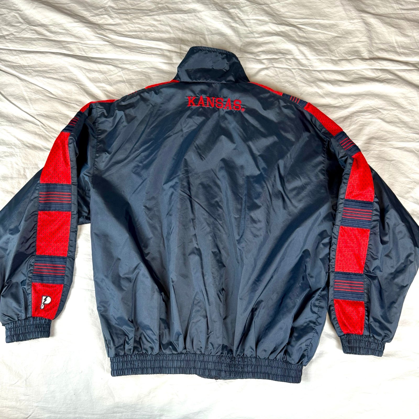 Vintage Men's Size Large Pro Player Nylon Windbreaker Track Suit with 2 Pants (one pair matches the jacket exactly and the other pair is labeled THJ Tommy Jeans 495); Kansas Jayhawks; blue and red; excellent condition; zipper jacket