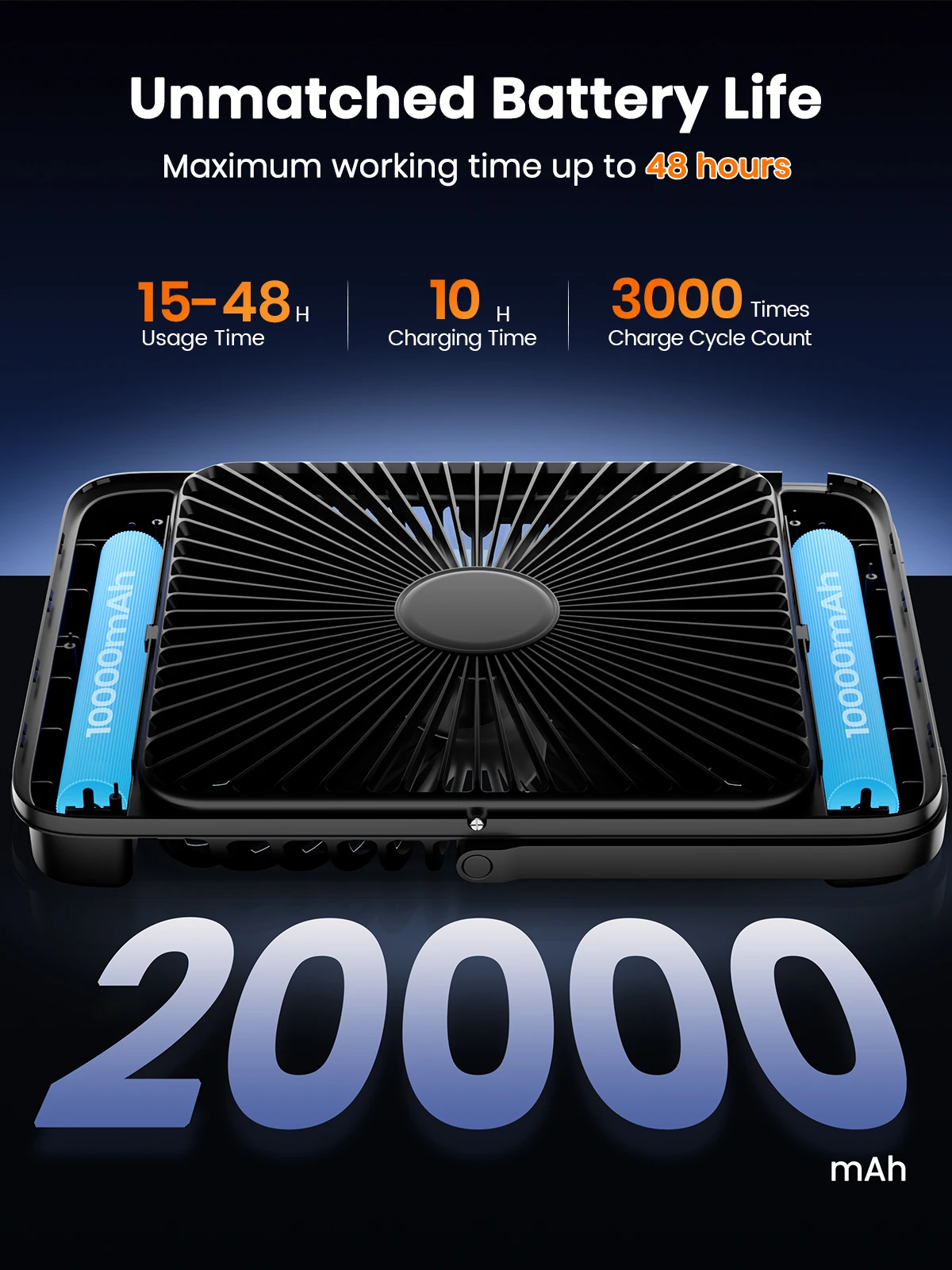 Powerful and Efficient Cooling Performance: Equipped with a high-capacity 20000mAh rechargeable battery, stay cool all day long with up to 15~48 hours of continuous operation from a single full charge. Its 4-speed settings and 5-blade design provide powerful yet whisper-quiet cooling, making it perfect for offices, homes, and outdoor adventures