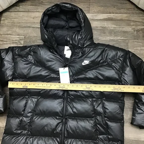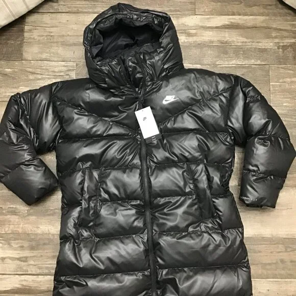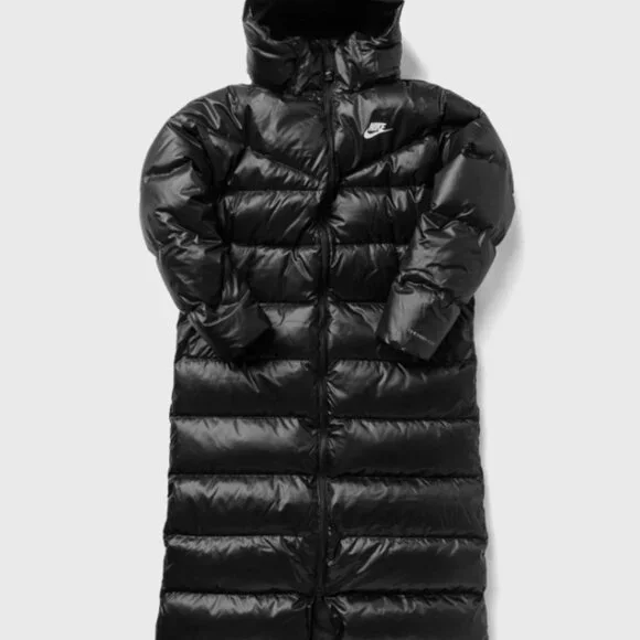 Women's Nike X-LARGE Therma-Fit Down-Fill Full Length Puffer Parka DH4081-010 NWT Retail $305Down Warmth - Down insulation adds warmth without added weight for a lightweight feel that packs in the heatSignature Nike Details - A Chevron shape separates the hood and shoulders from the down baffling, adding a signature Nike look. The Futura heat transfer logo on the chest has a flat, matte finish. The back neck loop sits under the hood and is accented with a woven Nike flag labelThe shell is made with smooth woven fabricThe lining is made with an equally smooth woven fabric made from recycled polyesterFront hand pockets provide quick storage for your phone, keys, and cold handsHeat transfer graphics on the cuff and lower back highlight Therma-FIT technologyLoose fit for a roomy feelITEM IS BRAND NEW AND HAS NEVER BEEN WORN OR TRIED ON.