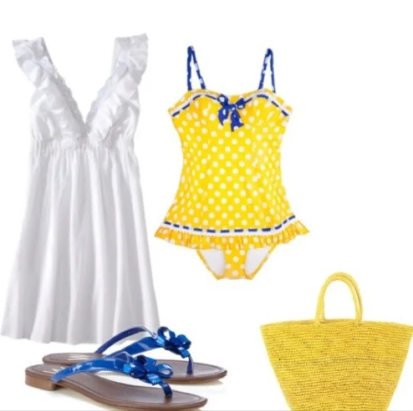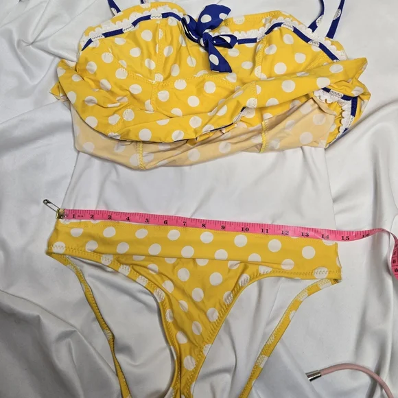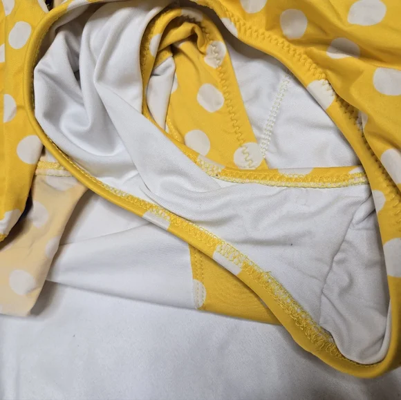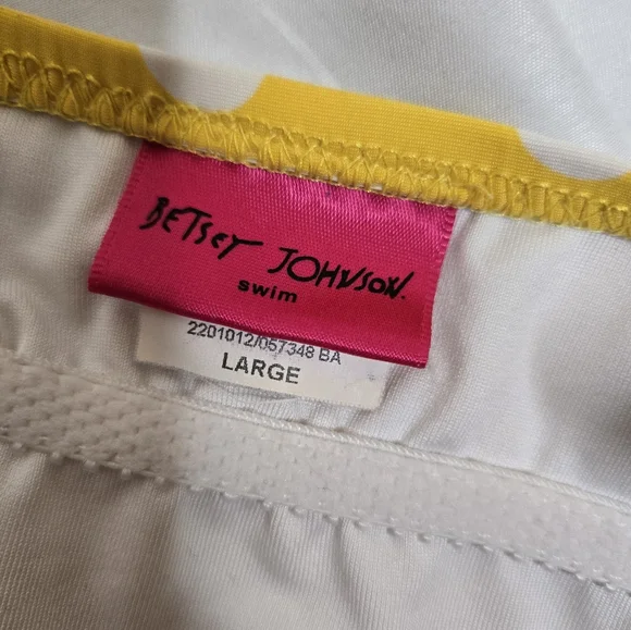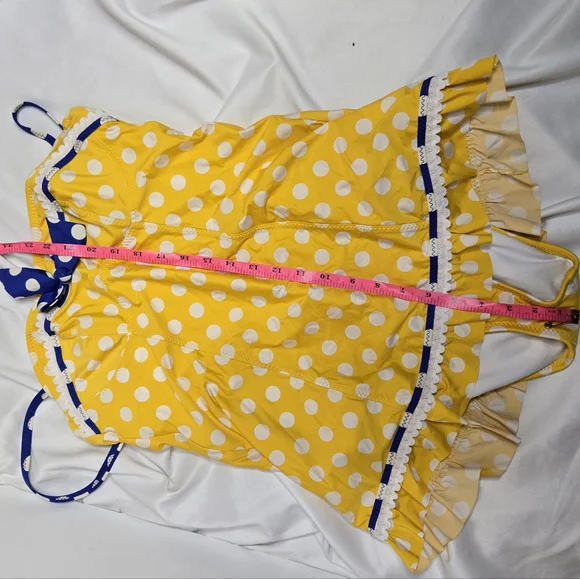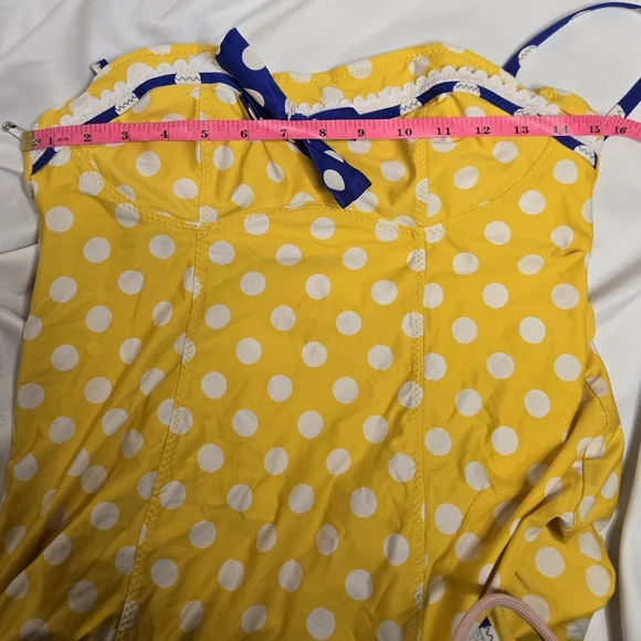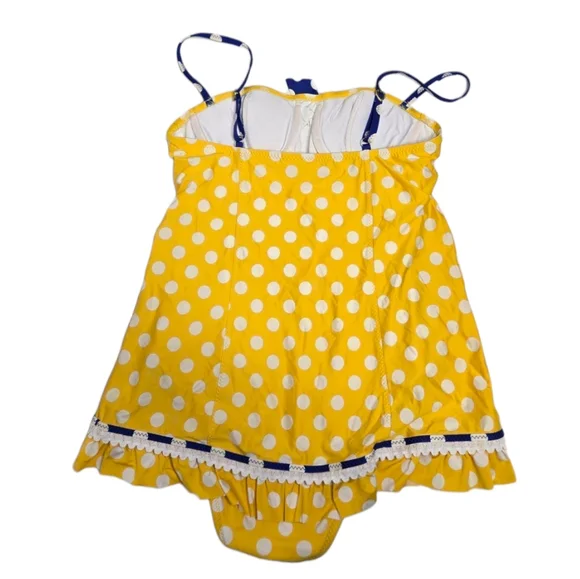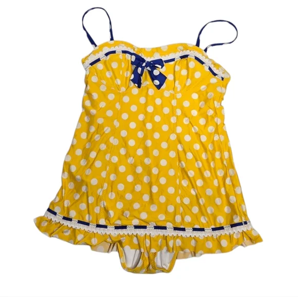 Betsey Johnson Swim Y2K pinup retro yellow polka-dot ruffle skirted swimsuit bathing suit. Adorable and modest. Shown with styling options in the last photo. Made in the USA. Nylon, spandex.Galaxy Finds has sold over 4000 items and ships next day! Highly rated - check my 5 star reviews. Vintage and modern items, womens, mens and childrens clothing.