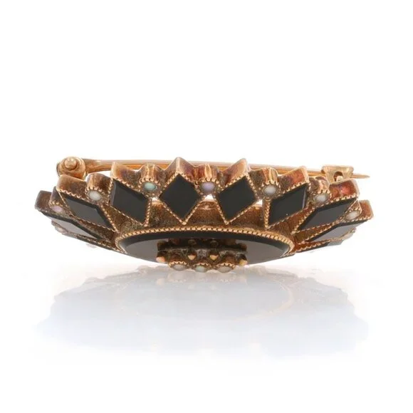 Era: EdwardianDate: 1900s - 1910sMetal Content: 10k Yellow GoldStone InformationNatural OnyxColor: BlackNatural Seed PearlsStyle: Convertible Brooch/PendantFastening Type: HInged Pin and Locking C-ClaspTheme: Floral StarburstFeatures: Milgrain DetailingMeasurementsTall: 1 1/16" (26.4mm)Wide: 1 5/16" (32.6mm)Interior of top bail opening measures (east to west): 1.5mmWeight: 5.8 GramsCondition: Pre-OwnedIn order to maintain its original antique integrity, this piece has not been professionally cleaned but it has been tested to guarantee metal content.