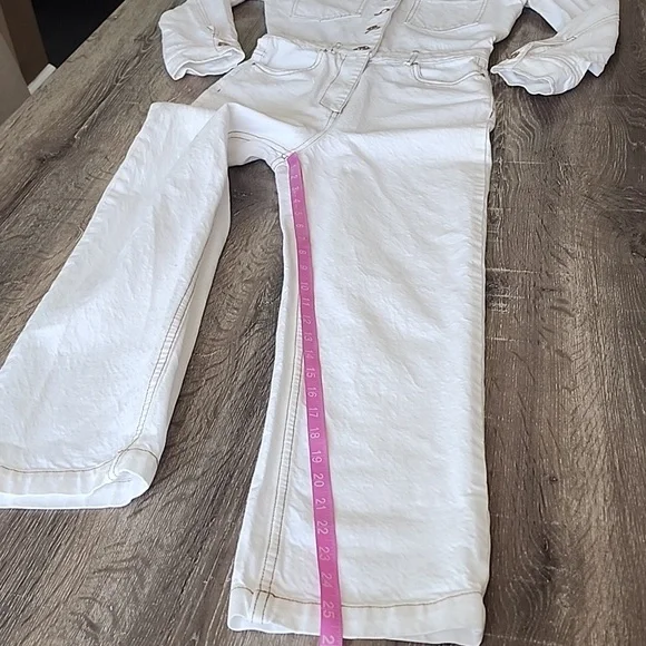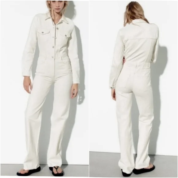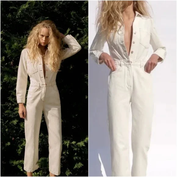 Elevate your style with this chic cream jumpsuit. Perfect for any occasion, it offers a blend of comfort and elegance.Long jumpsuit with V-neck lapel collar and long cuffed sleeves. Front pockets and back patch pockets. Straight leg. Front button closure.BLOGGERS FAVORITE 😍 Point collar with V-neck Copper color front button closure and zipper 2 front pockets at the chest 2 front pockets at the waist 2 back pockets Belt loopsChest: 17inWaist 13inInseam 26inFaint spot on front which I have pointed out, hardly noticeable as this one piece jumpsuit is incredible!
